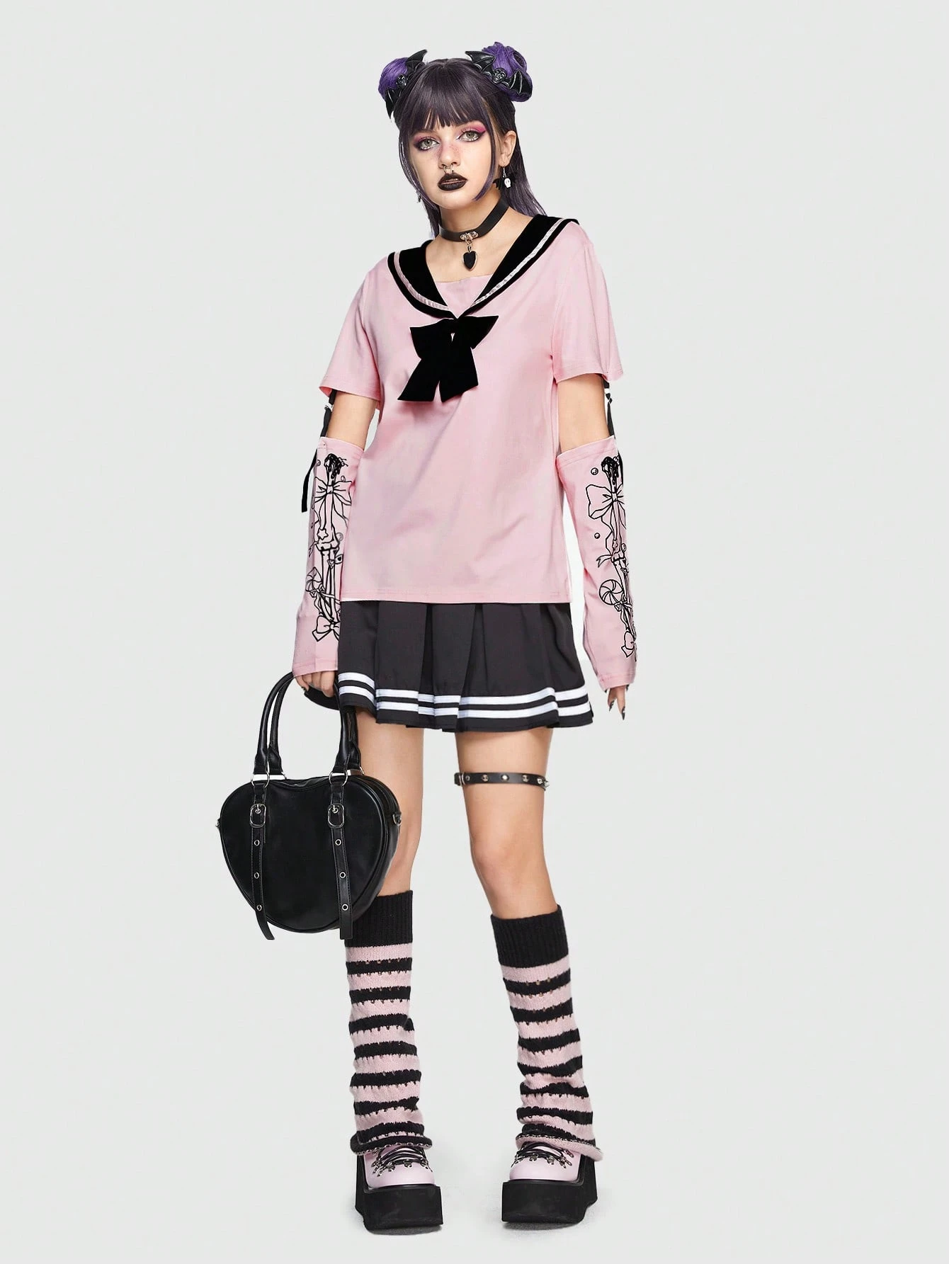 Kawaii Camiseta cuello marinero con lazo delantero con mangas
