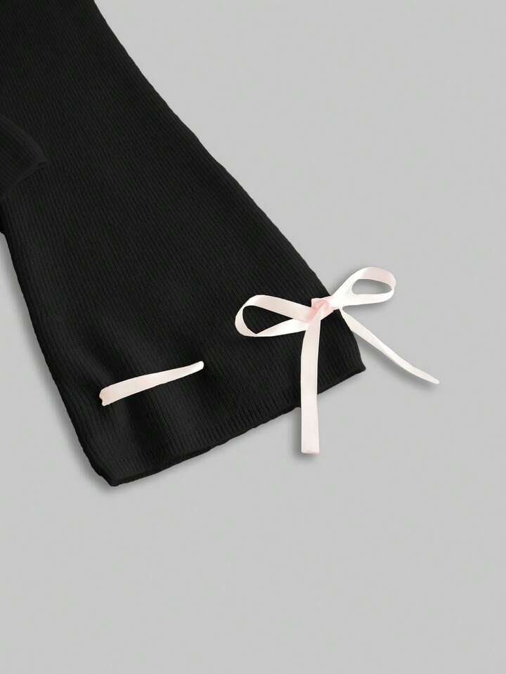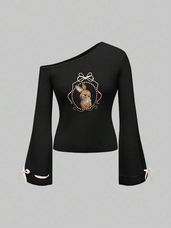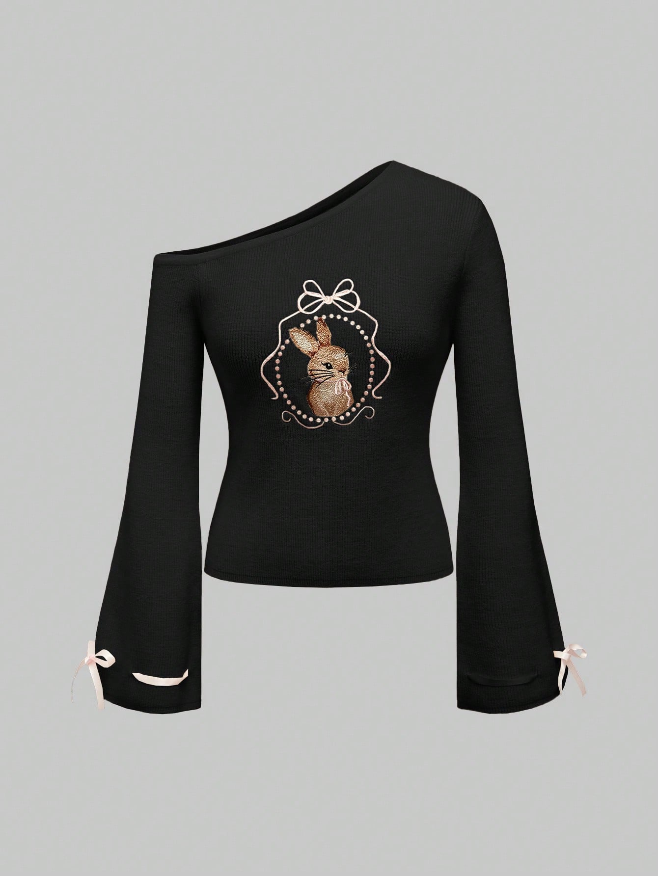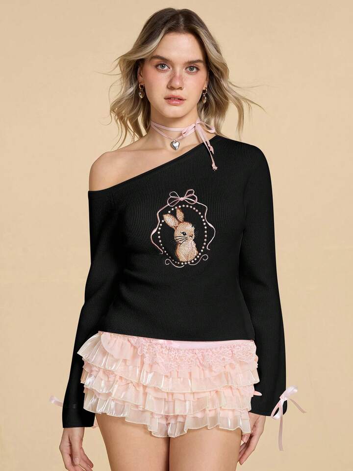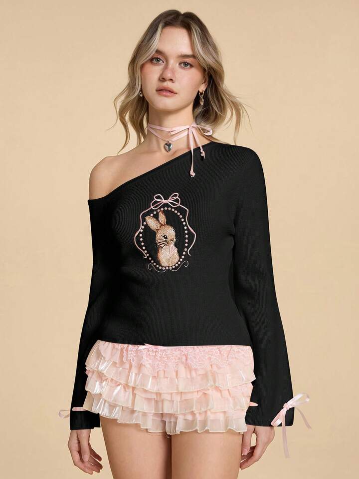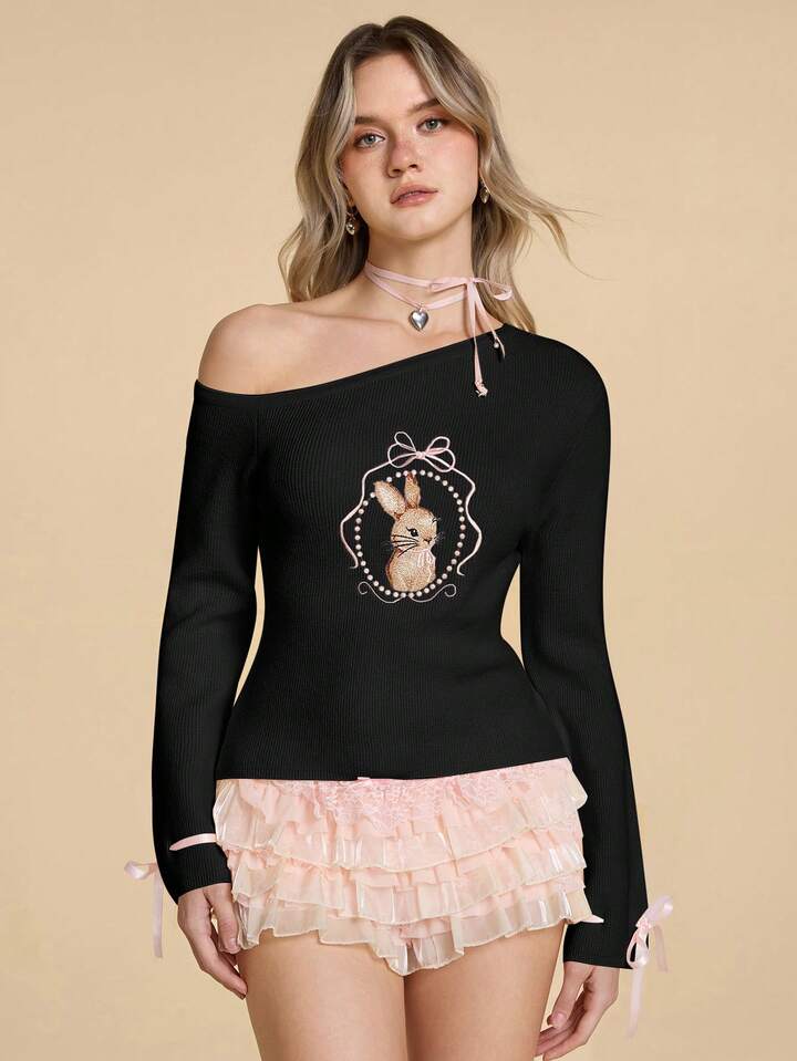 Kawaii Suéter con bordado de conejo y lazo sexy