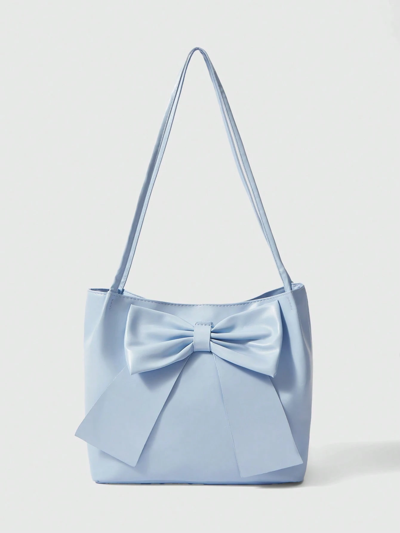 Kawaii Bolso de hombro de mujer de gran capacidad, elegante y de moda, con decoración de lazo de piel de PU de unicolor y ligero