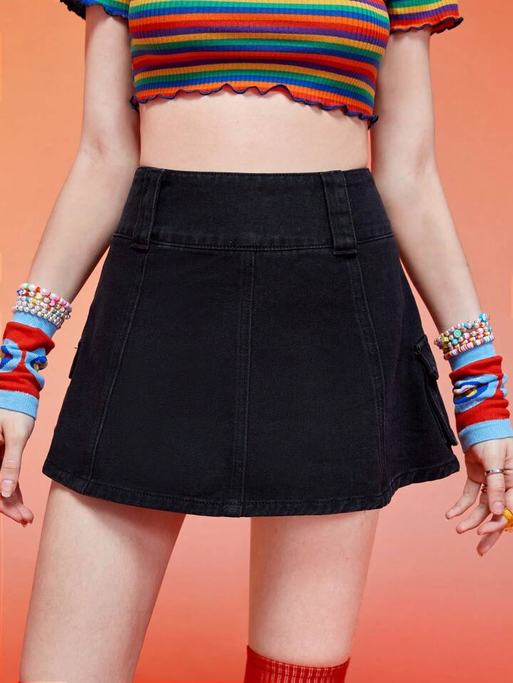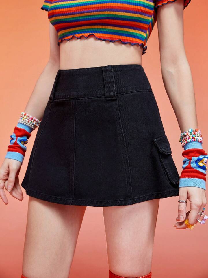 Kawaii Falda en mezclilla unicolor con bolsillo con solapa