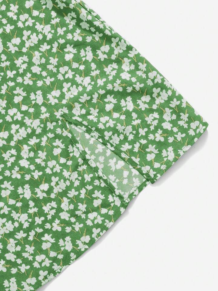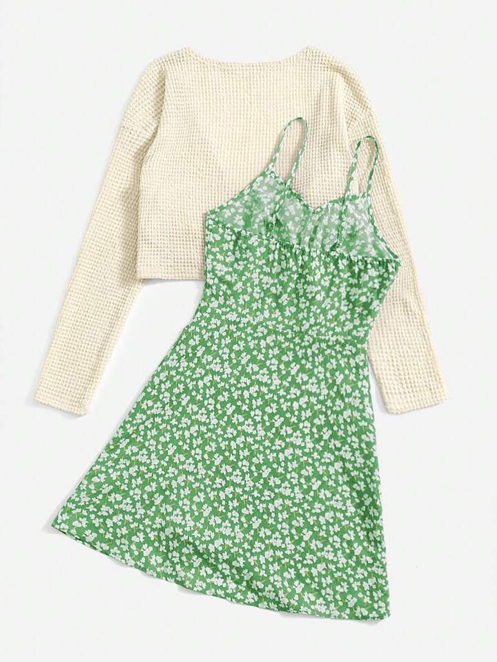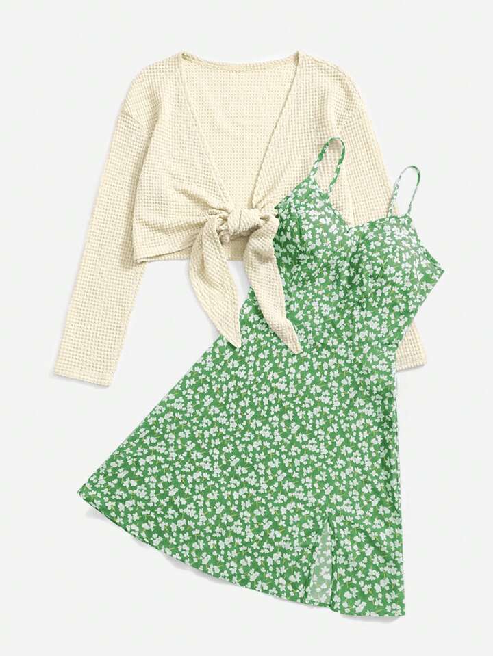 Kawaii Top crop unicolor con cordón delantero & Vestido de tirantes floral con abertura