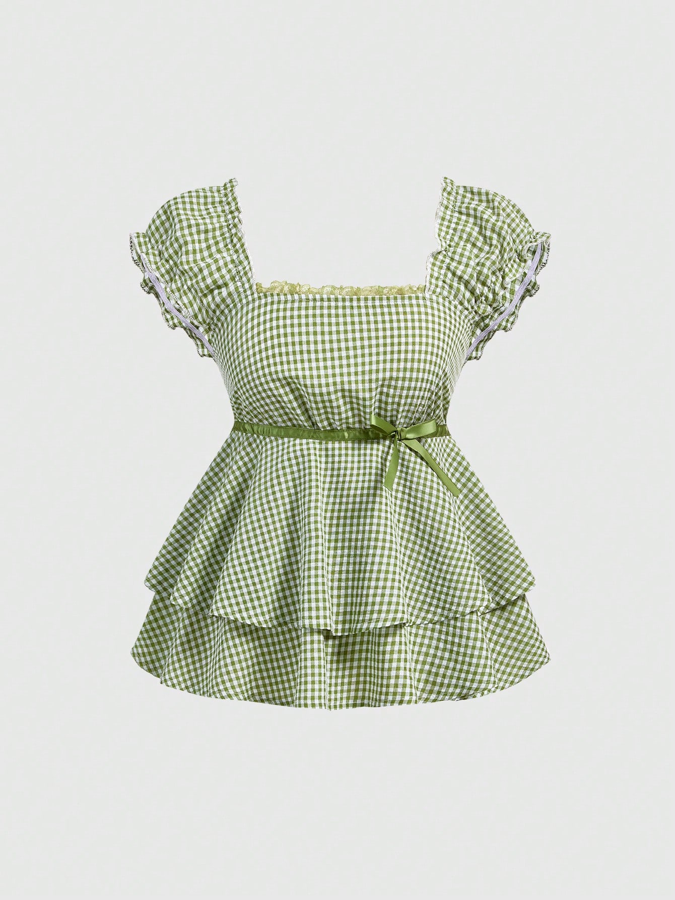 Kawaii Vestido camisa cuadros con cuello cuadrado y decoración de lazo en línea A