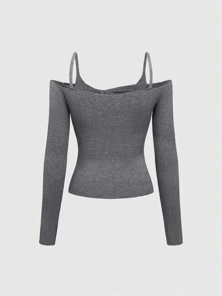 Kawaii Suéter gris para mujer con mangas largas elásticas, cuello de volantes con lazo, hombros descubiertos y cintura elástica, de estilo elegante y dulce de primavera