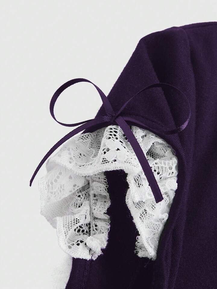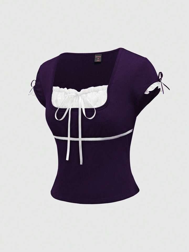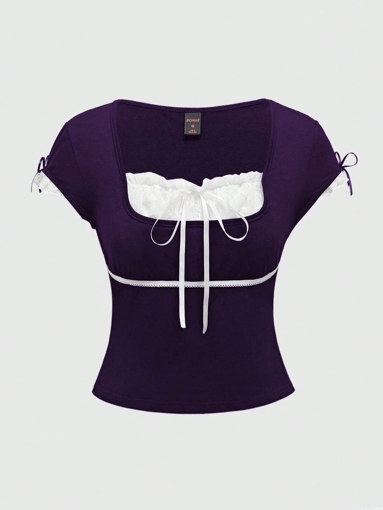 Kawaii Camiseta de mujer de 2 en 1 con cuello cuadrado, parches de encaje, mangas de campana de estilo ballet y contraste de colores
