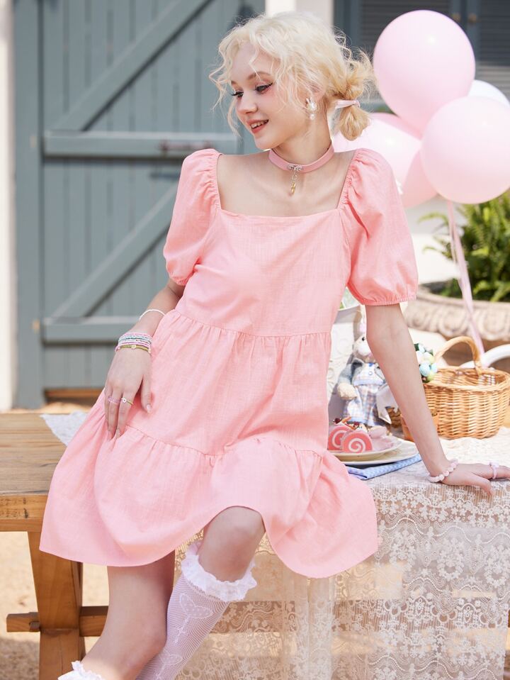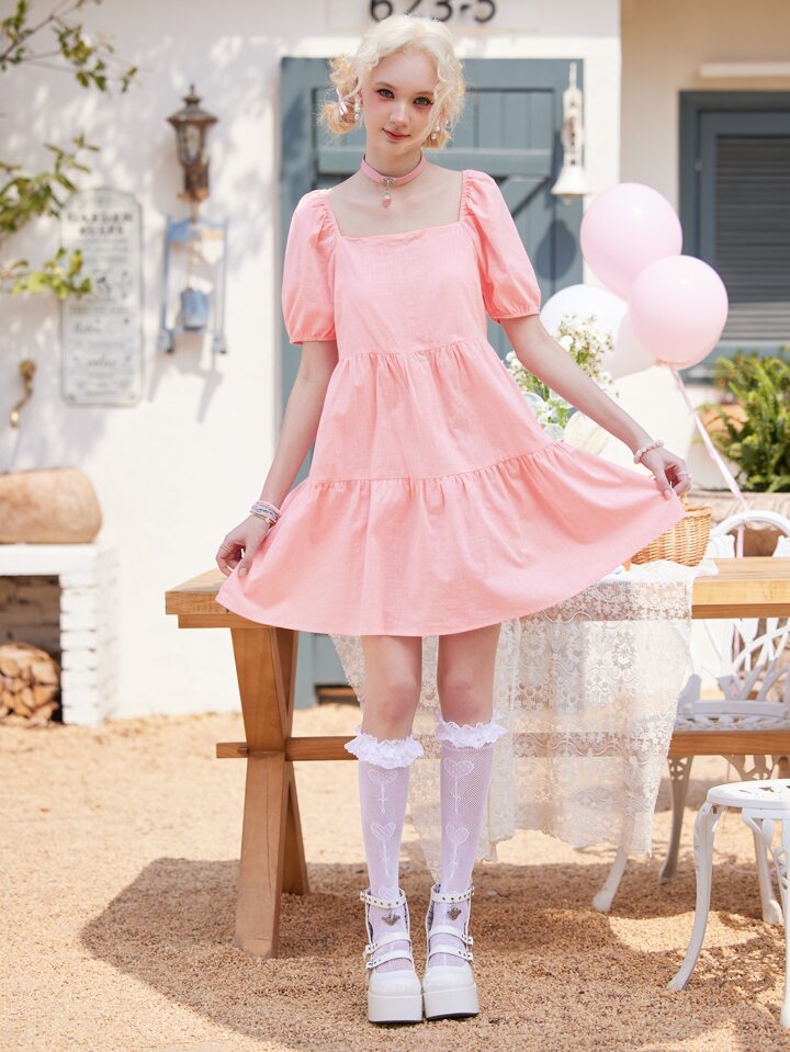 Kawaii Vestido de cuello cuadrado de manga farol bajo con fruncido