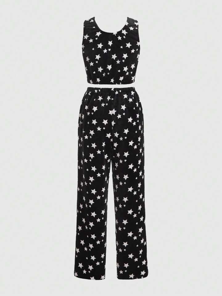 Kawaii Conjunto De Pijama De Top De Tanque Con Patrón De Estrella Y Tirantes Gruesos + Pantalones Largos