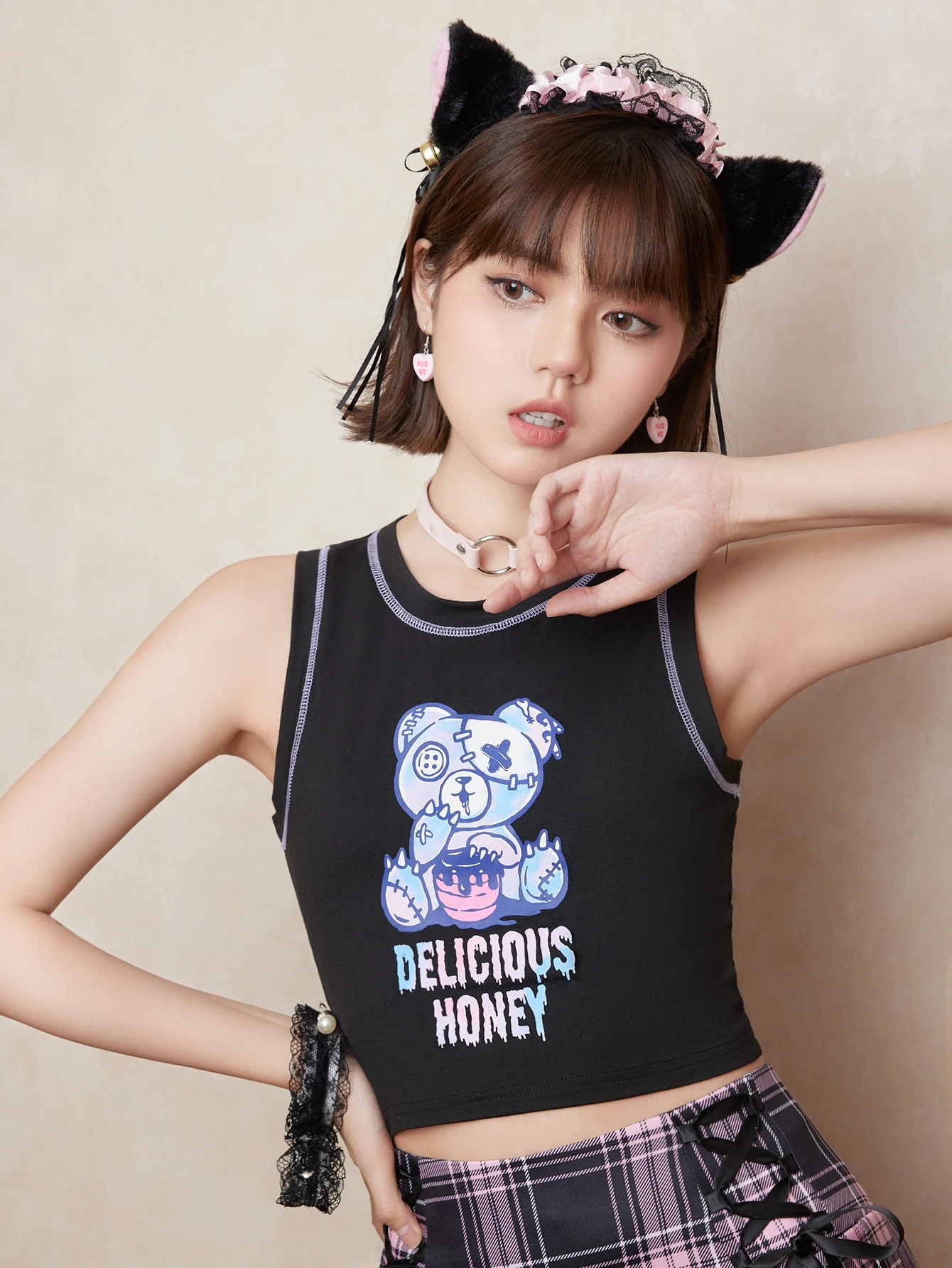 Kawaii Top tank ribete con puntada con letra con estampado de oso de dibujos animados