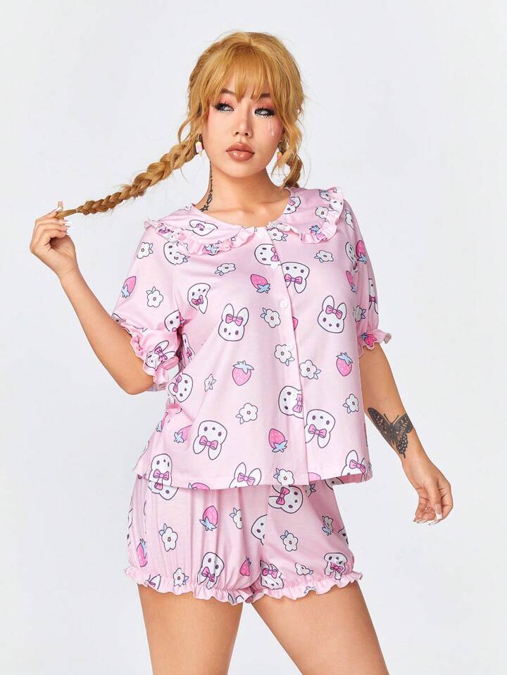 Kawaii Conjunto De Pijama De Manga Abullonada Con Decoración De Lazo Y Estampado De Fresas Y Tops De Manga Corta Con Frente Abierto Y Ribete De Volantes, Mujer