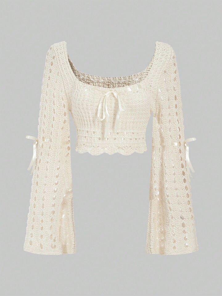 Kawaii Suéter corto de punto hueco de unicolor tejido a ganchillo, escuela