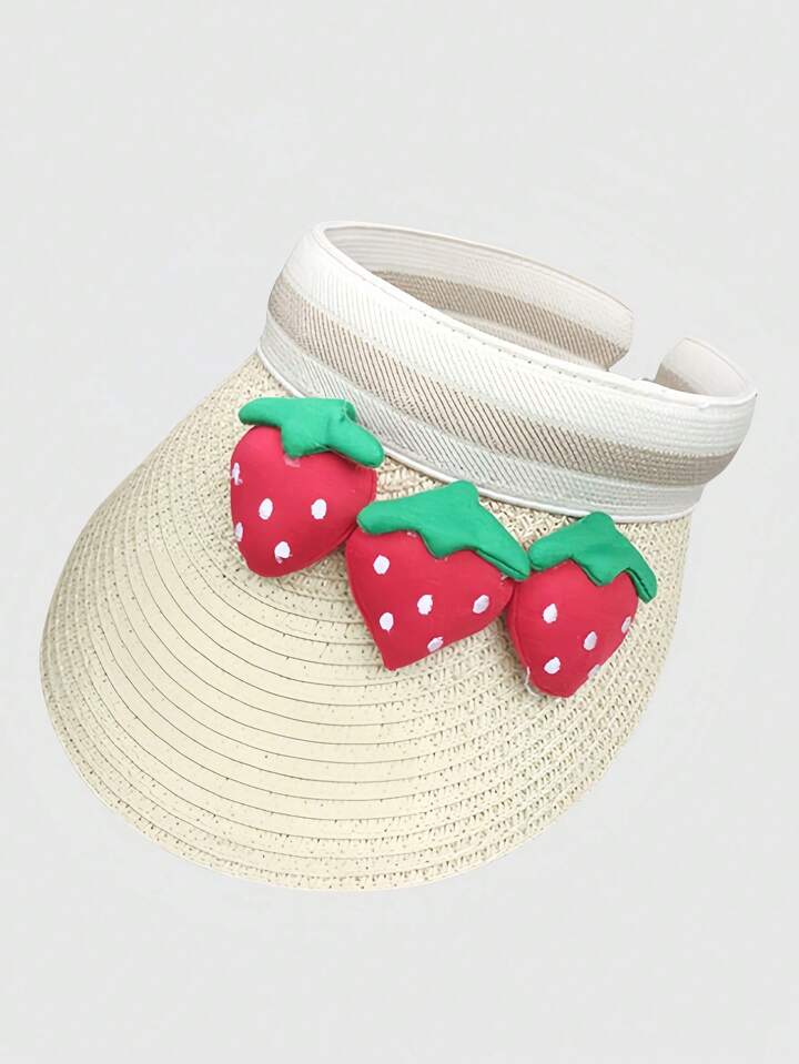 Kawaii Sombrero de playa de verano con parches de fresas, decoración de frutas lindas y ala ancha para protección UV