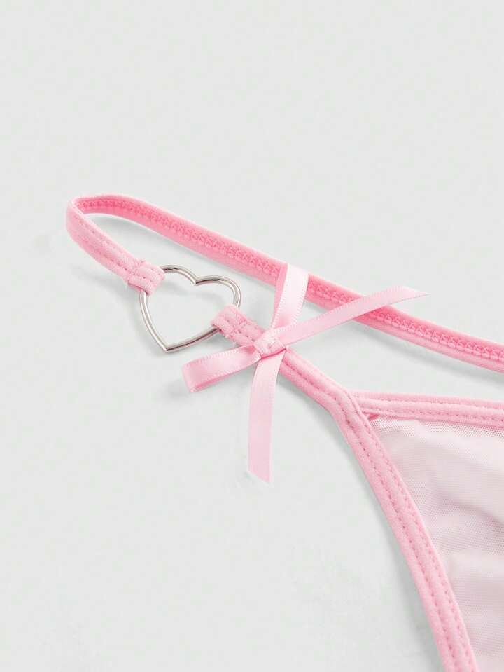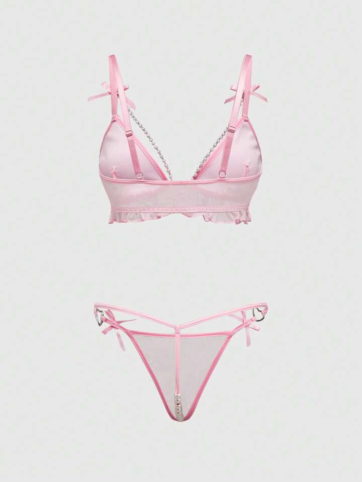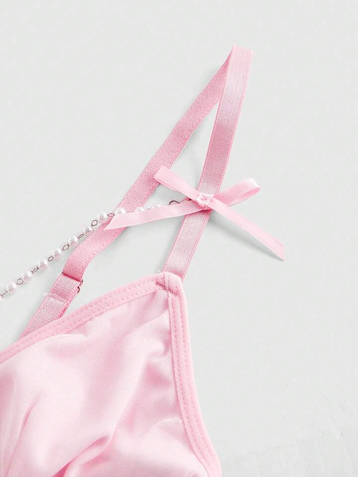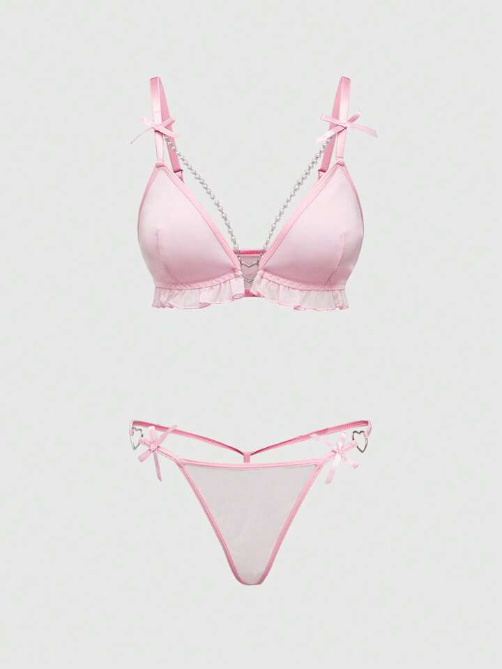 Kawaii Conjunto de lencería para mujer con cadena de perlas, corazón con lazo y encaje, sensual y romántico