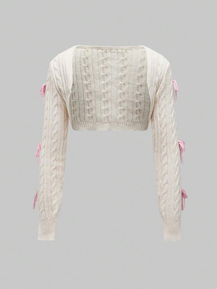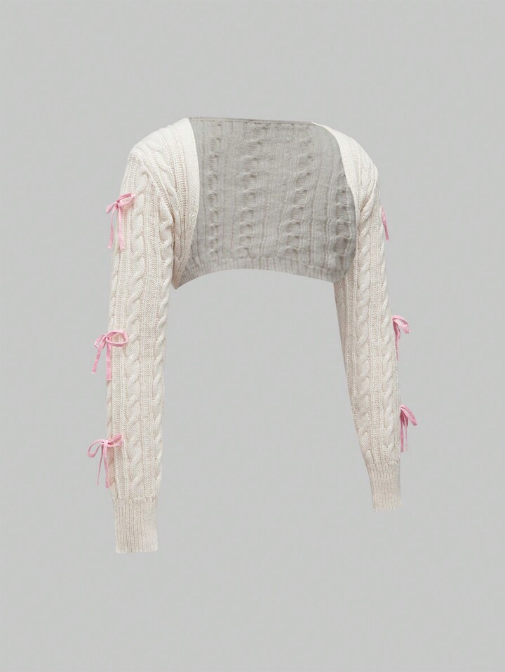 Kawaii Cárdigan corto dulce de unicolor para adolescentes con arco decorativo y mangas de punto retorcido