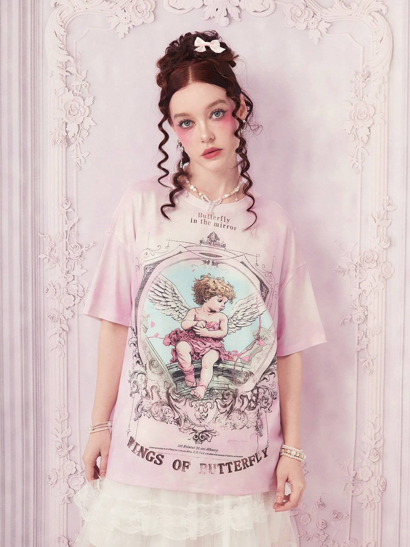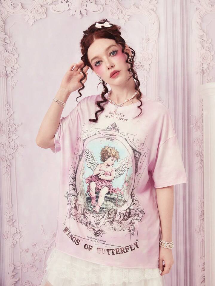 Kawaii Camiseta de hombros caídos de tie dye con estampado de figura