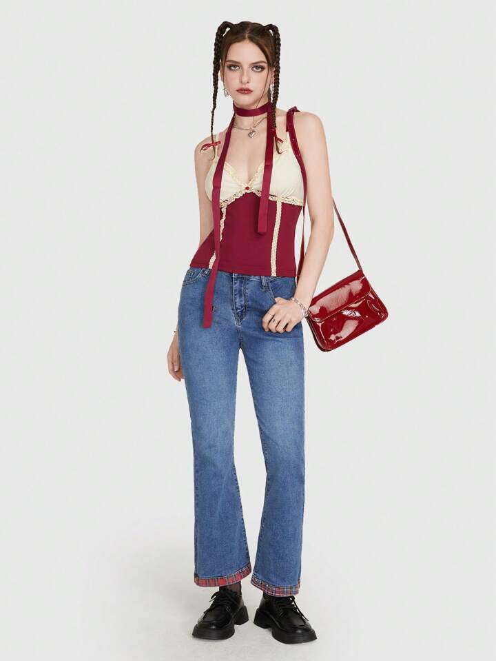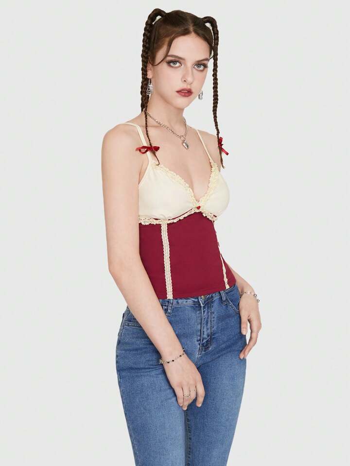 Kawaii Top de tirantes de dos tonos ribete con encaje