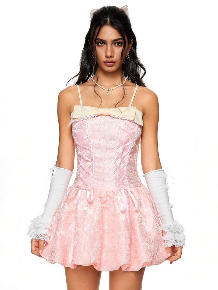 Kawaii Vestido de tirantes finos con diseño de lazo y capullo estilo vintage, diseño de cintura con cordón, tela con estampado oscuro, vestido corto de mujer de tirantes finos