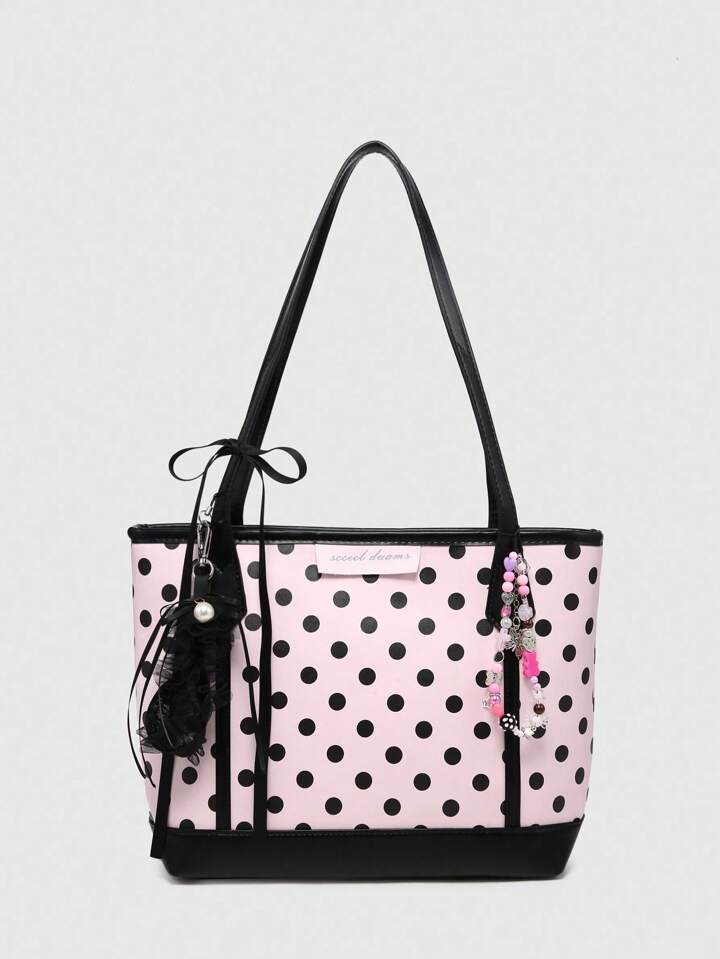 Kawaii Bolso de mano grande con capacidad de carga, con tirantes de lunares y lazo, estilo vintage, adecuado para compras y escuela