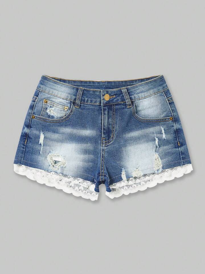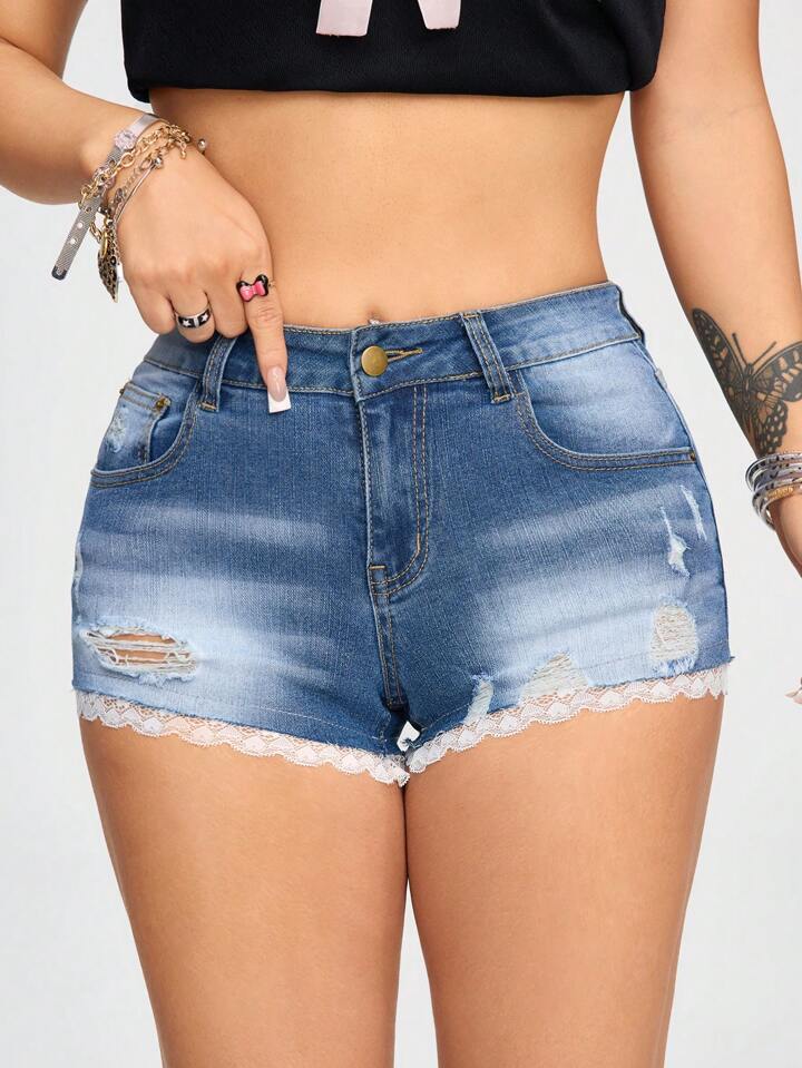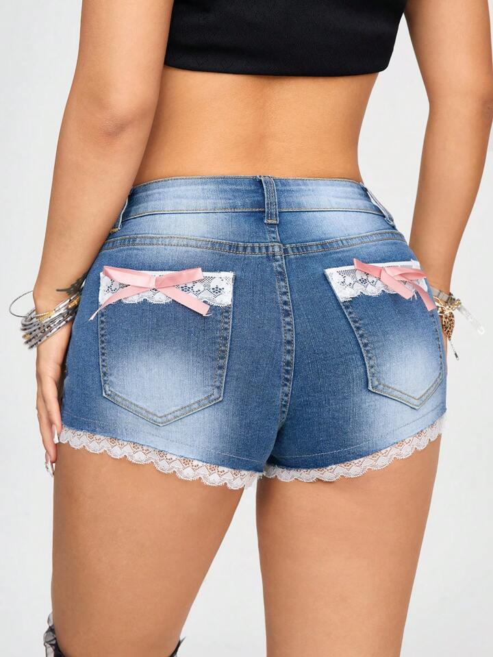 Kawaii Pantalones cortos vaqueros con encaje en contraste lavados, para la escuela
