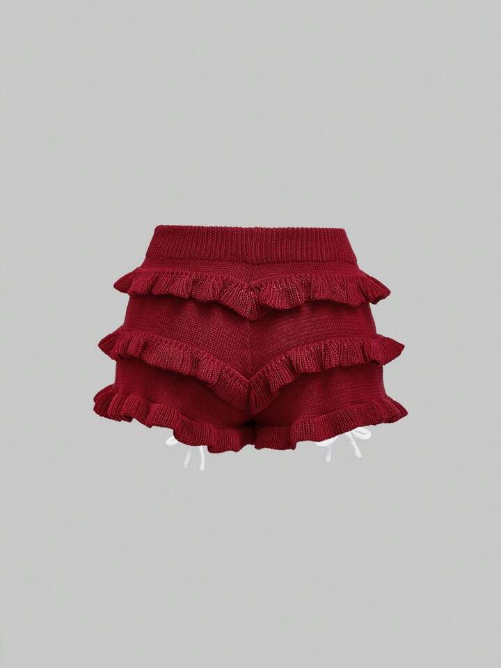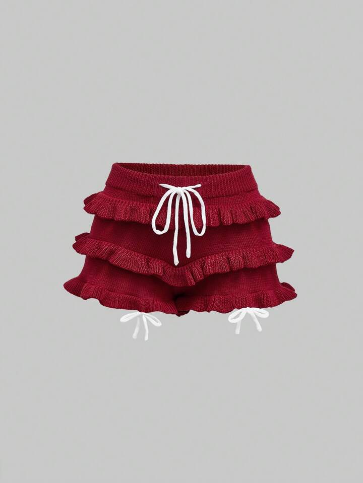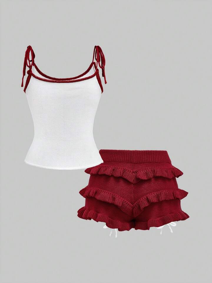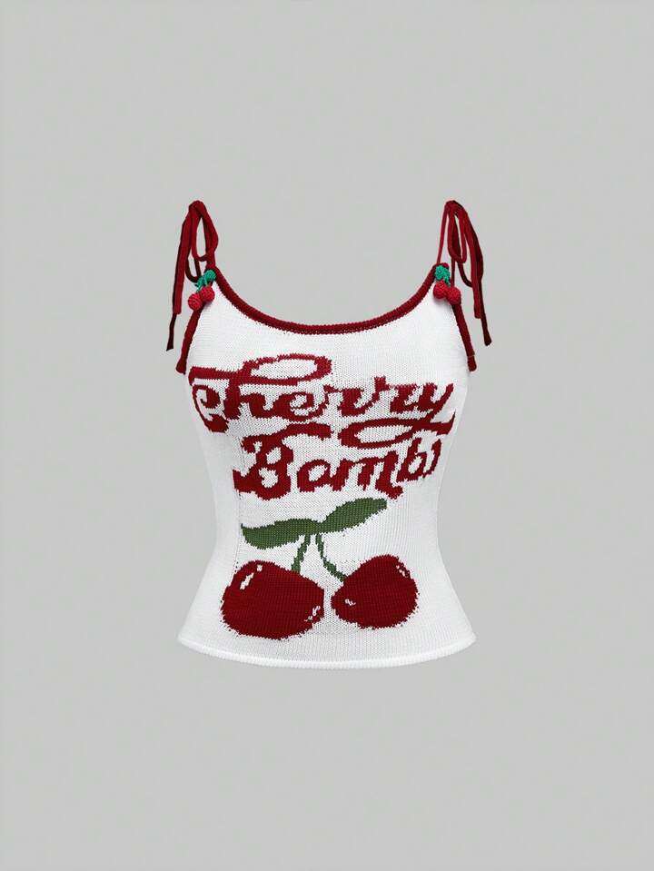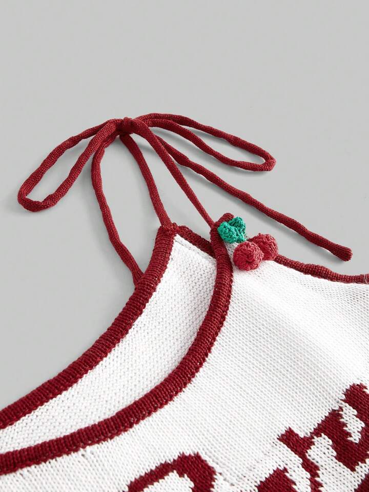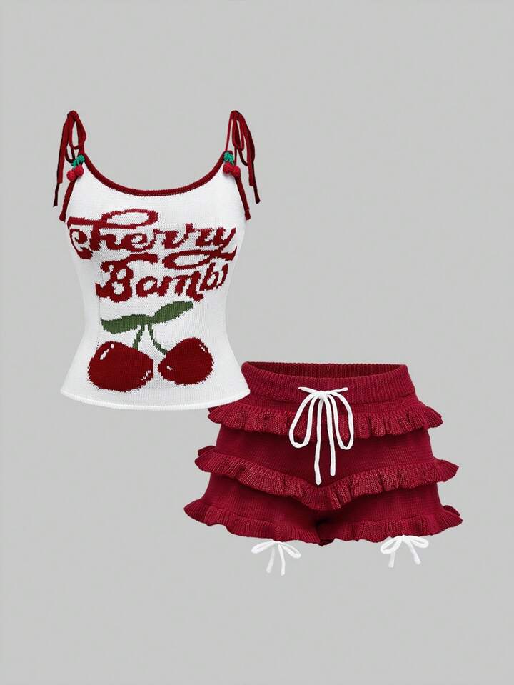 Kawaii Conjunto de 2 piezas para mujer, con top de tirantes y falda de volantes estampado jacquard de cereza