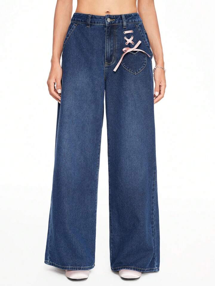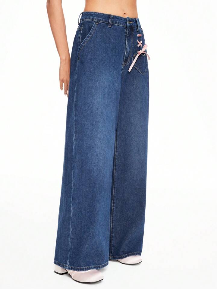 Kawaii Vaqueros rectos casuales sueltos de mujer con lazada en la cintura, bucles para cinturón y bolsillos