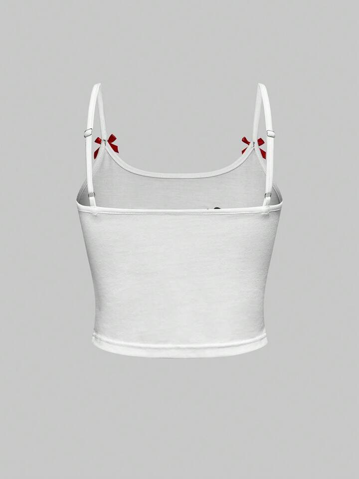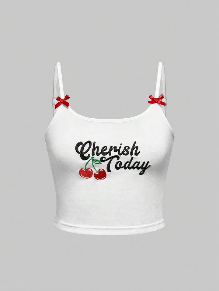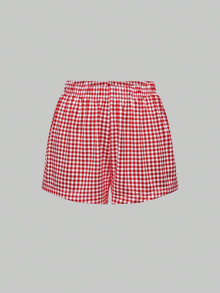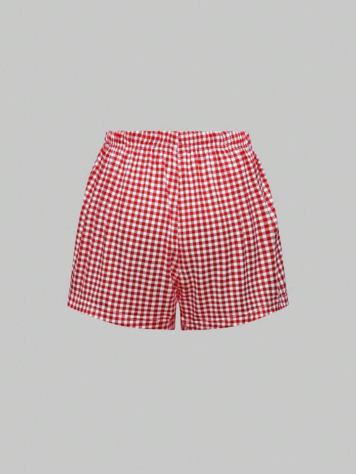 Kawaii Conjunto de pijama informal de top de tirantes con bordado de cereza y lazo y shorts a cuadros para mujer
