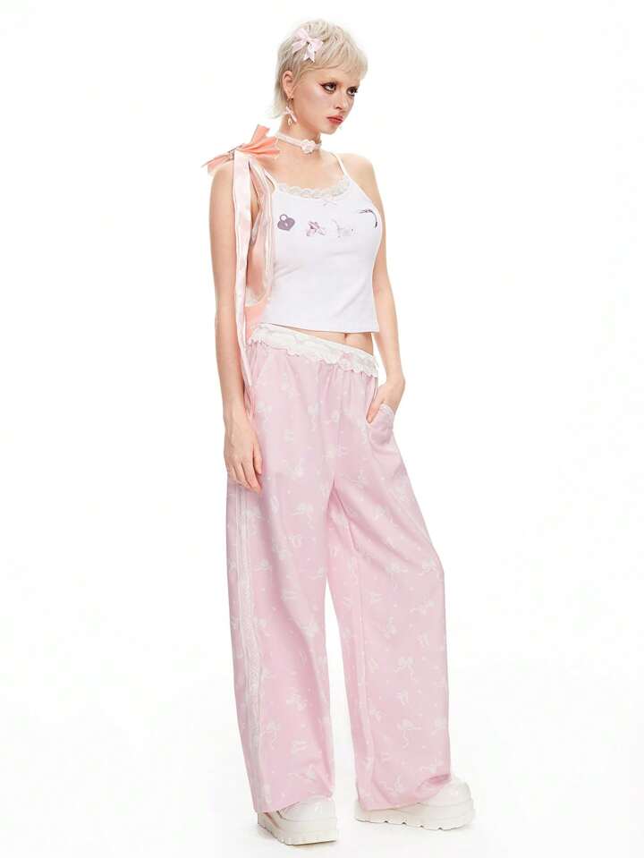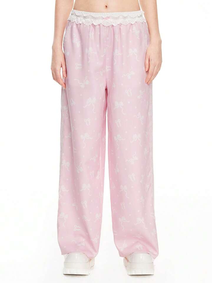 Kawaii Pantalones rectos de bloque de color con estampado de lazo y cintura de encaje para mujeres