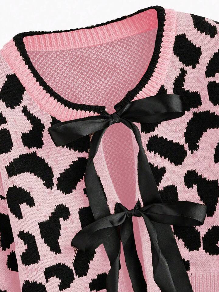 Kawaii Blusa casual de manga larga con estampado de leopardo y cierre de lazo adelante, para uso diario