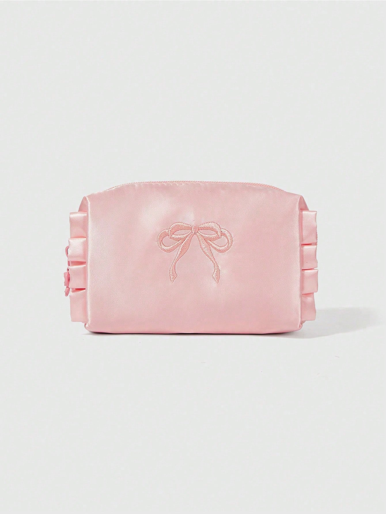 Kawaii Bolsa de maquillaje vintage y linda con bordado de moño + tirador de cremallera con moño