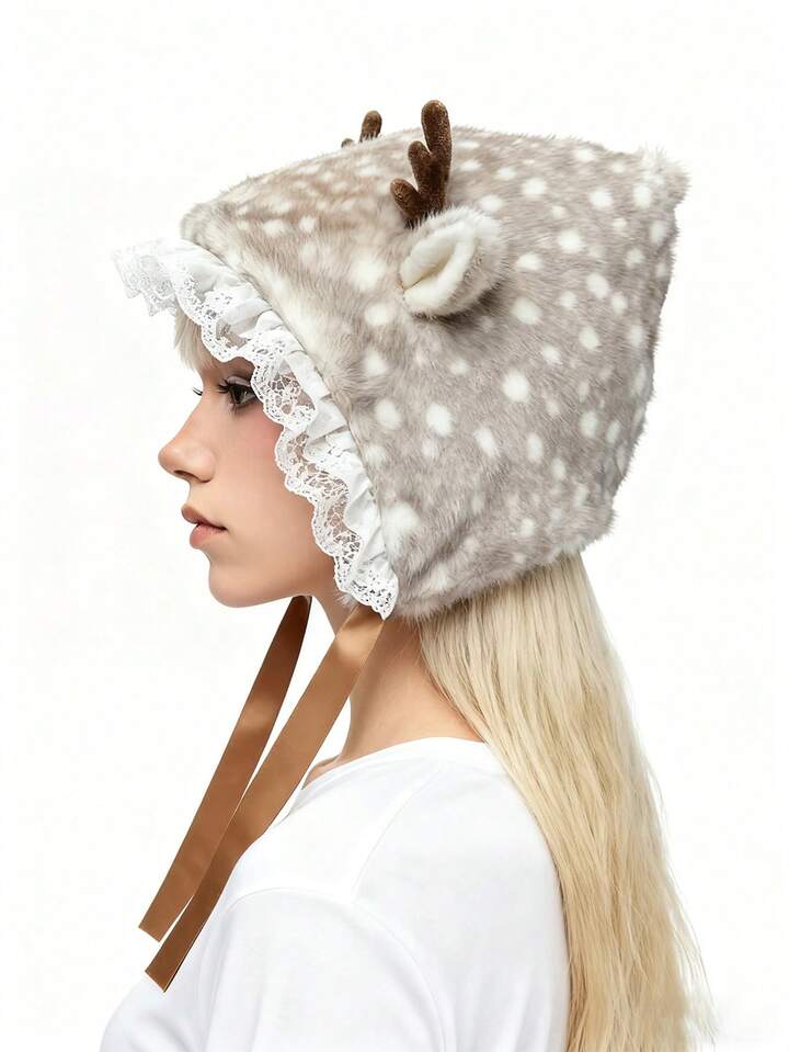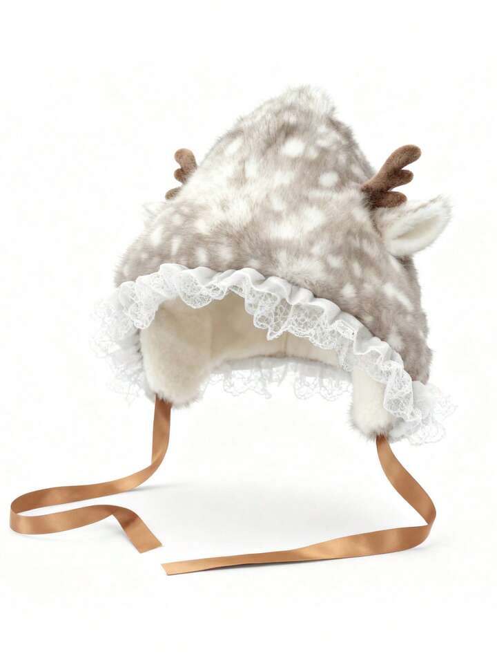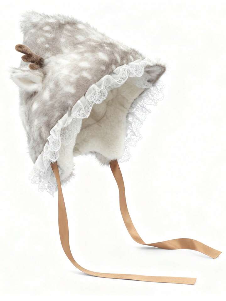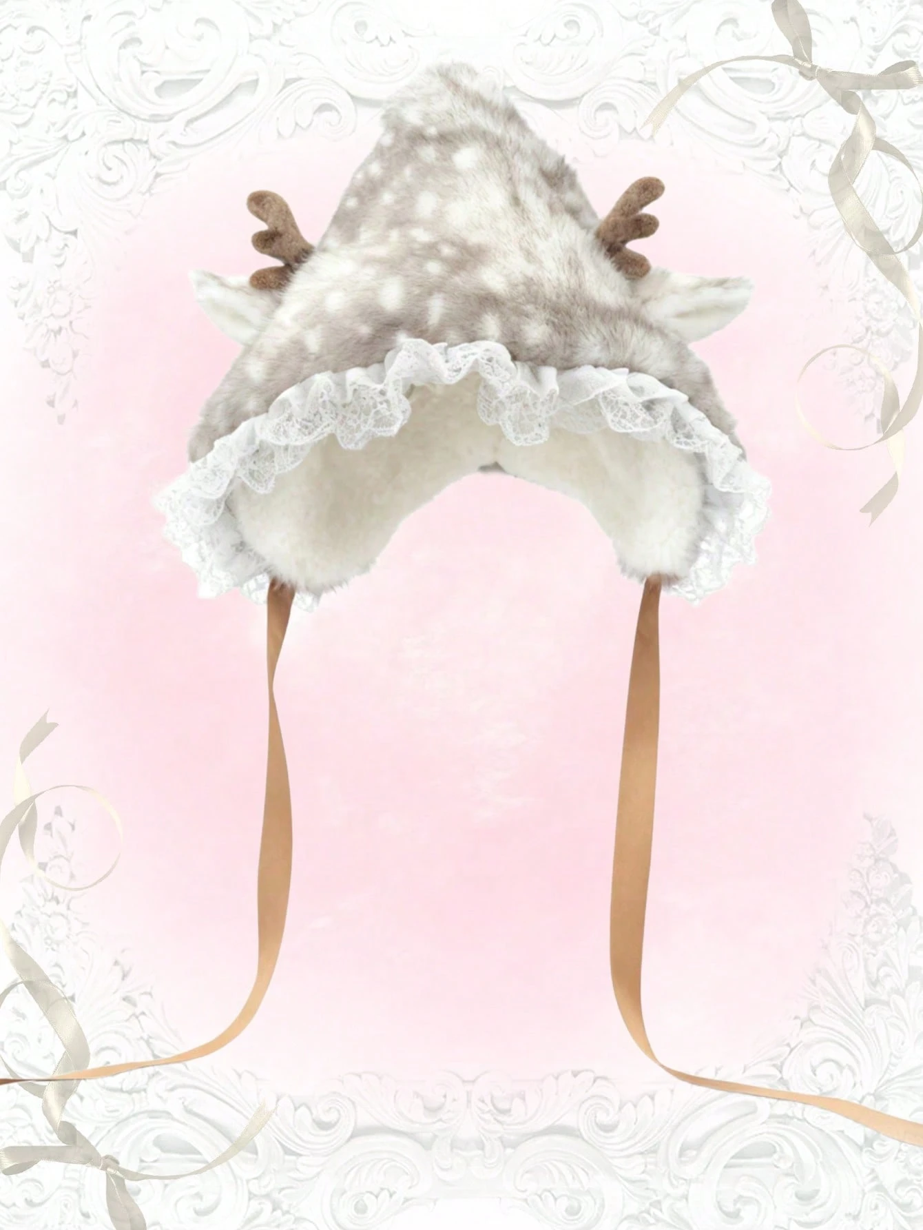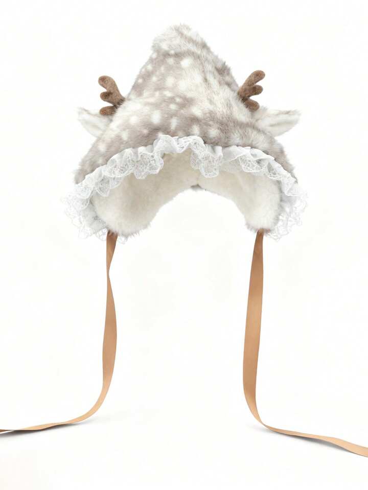 Kawaii Sombrero de invierno para mujer estilo Mori Girl de 1 pieza con diadema de orejas con cuernos de ciervo de piel sintética y encaje, sombrero con adorno de encaje, sombrero grueso y cálido para protección de orejas en invierno