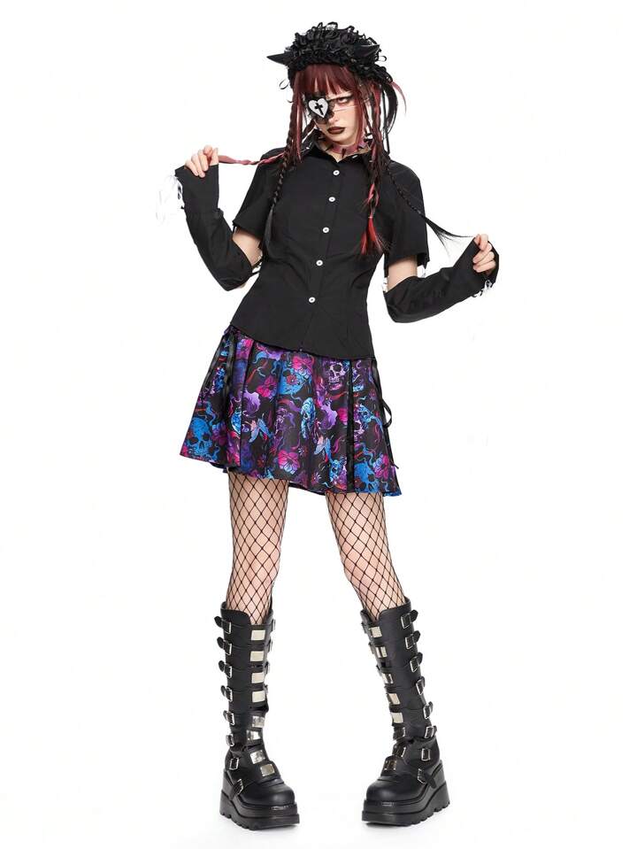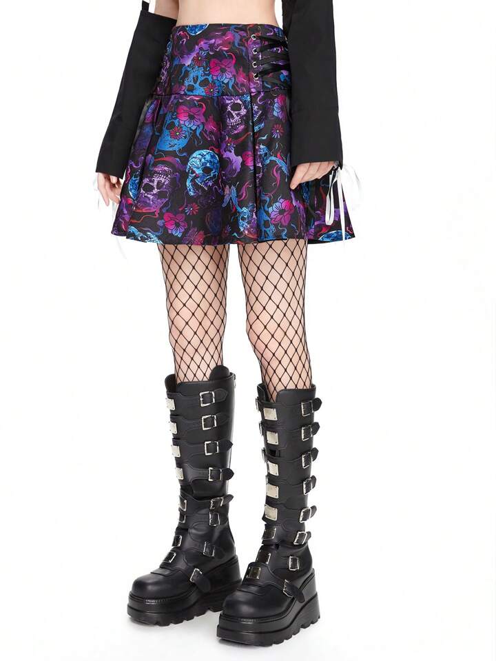 Kawaii Falda acampanada con cordones, patchwork de encaje con calavera y flores, estilo Y2K para mujer