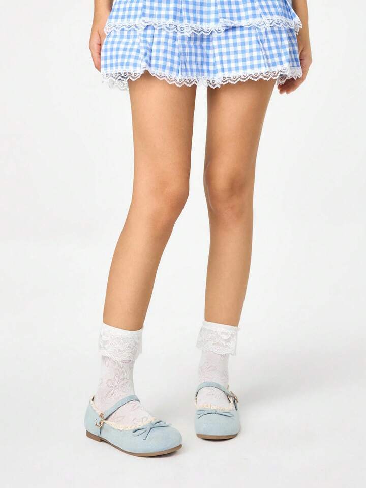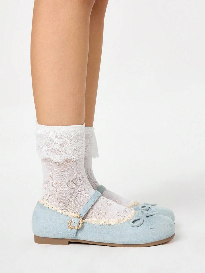 Kawaii Zapatos de mujer tipo Mary Jane azules, mocasines de punta cerrada, bailarinas tipo Lolita con lazo y encaje