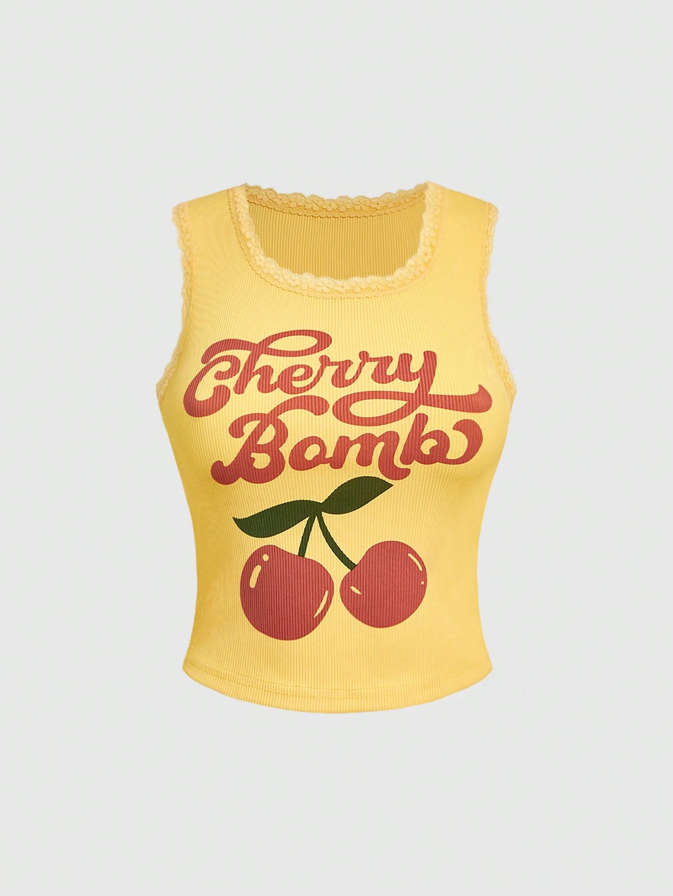 Kawaii Camiseta de tirantes casual de mujer con estampado de cereza, verano