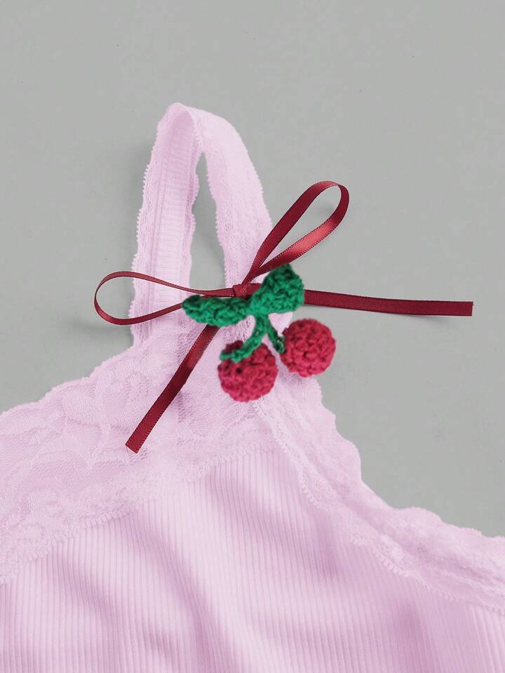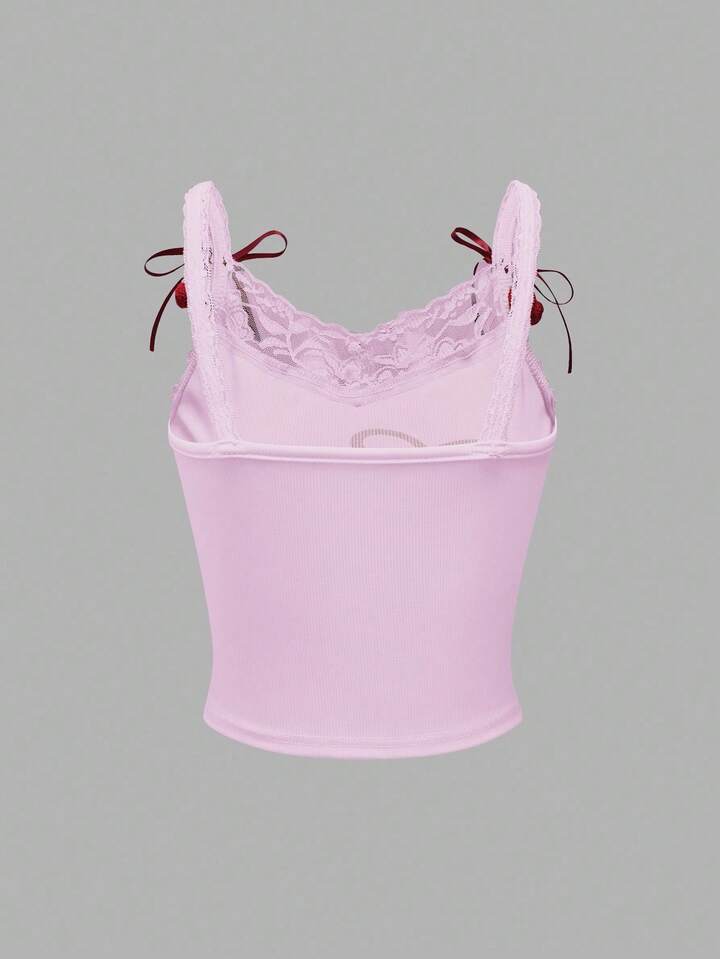 Kawaii Camiseta de tirantes casual de mujer con estampado de cerezas y ribete de encaje