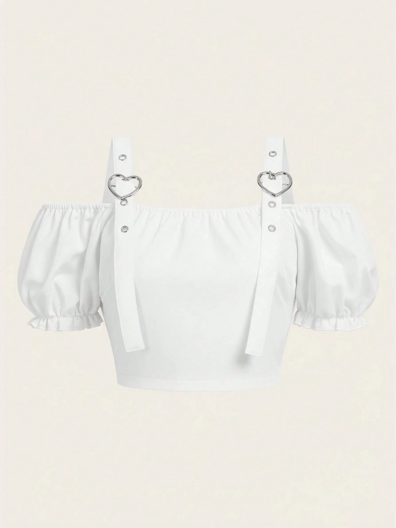 Kawaii Blusa ajustada de verano con hombros descubiertos, manga abullonada y volante, de unicolor y ajustable, para uso diario y casual