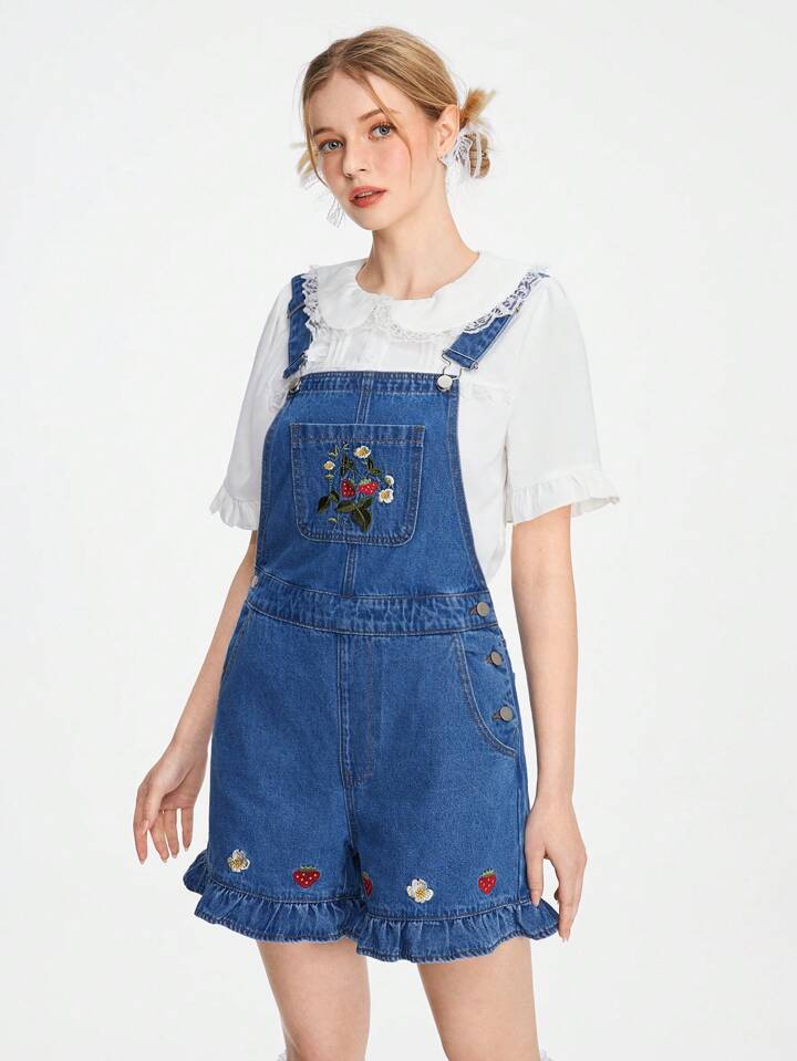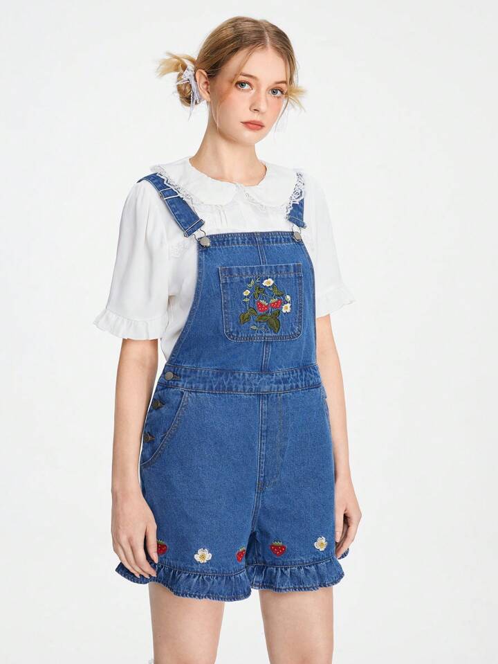 Kawaii Overol de mezclilla de bordado floral de fresa casual para mujer para el verano
