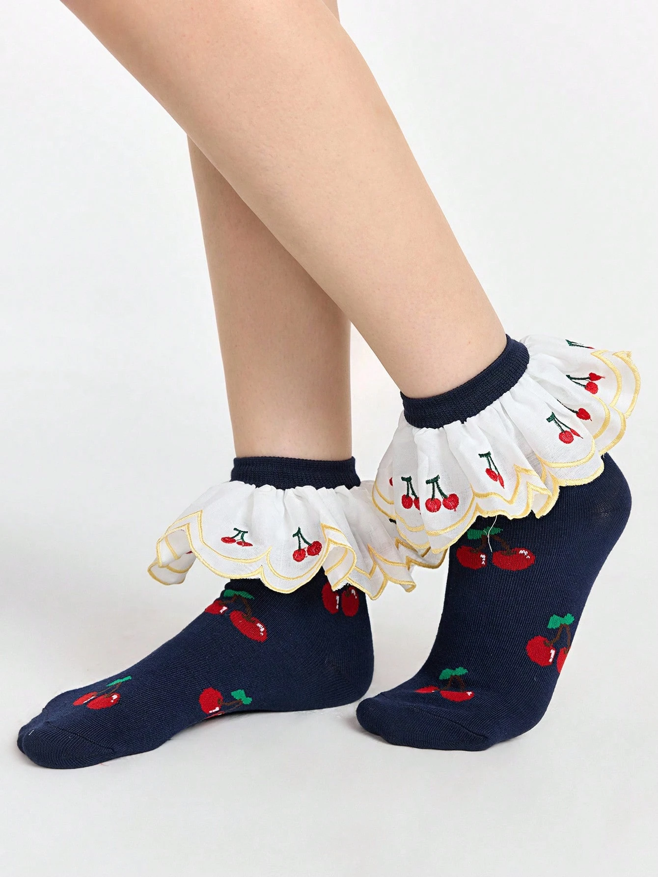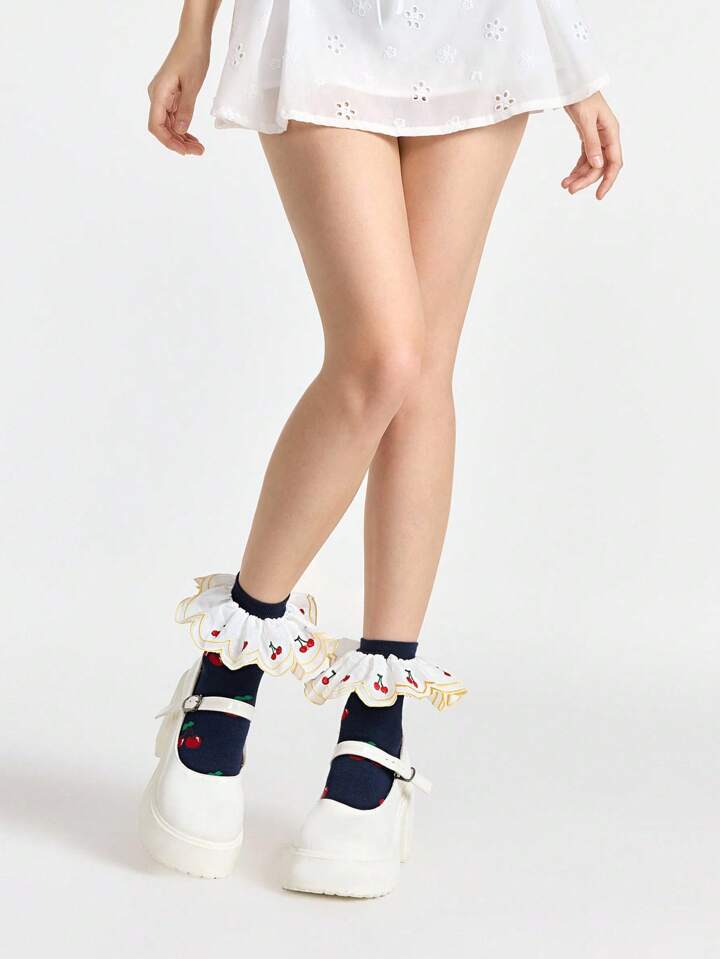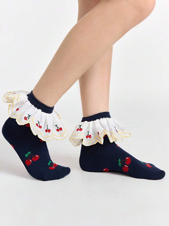 Kawaii Calcetines a media pierna bonitos con volantes y estampado de cerezas para mujer