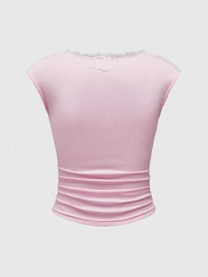 Kawaii Blusa casual de mujer con cuello redondo sin mangas, estampado de gato de dibujos animados y encaje de contraste, para la escuela