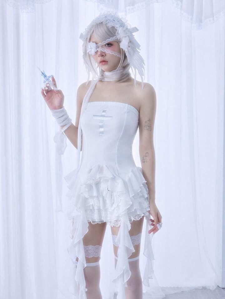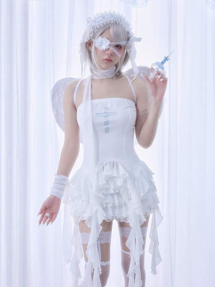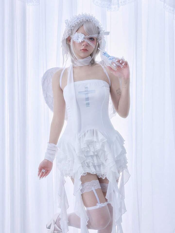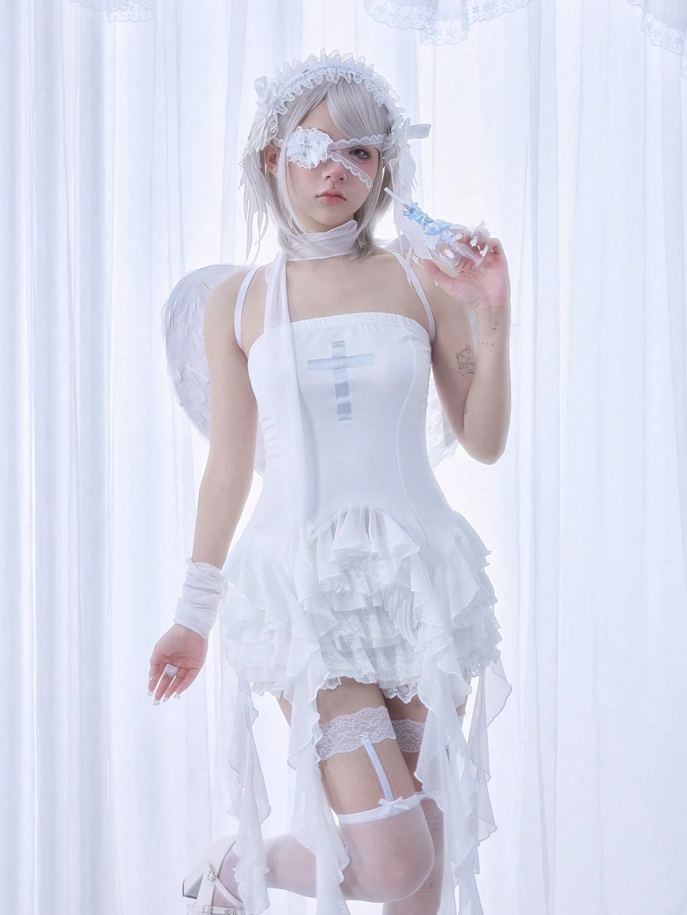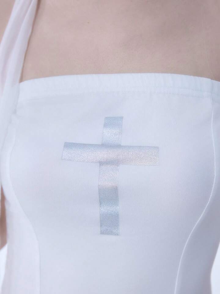 Kawaii Camiseta ajustada con estampado de cruz, volantes asimétricos y bajo con volantes para mujer