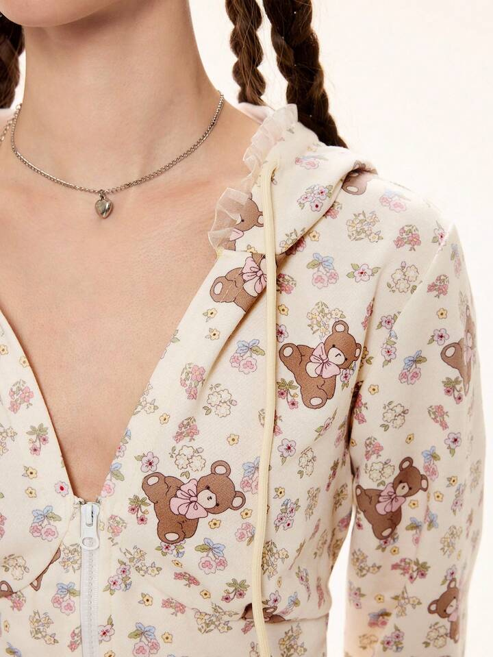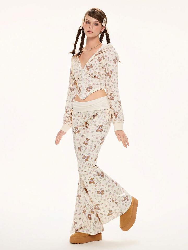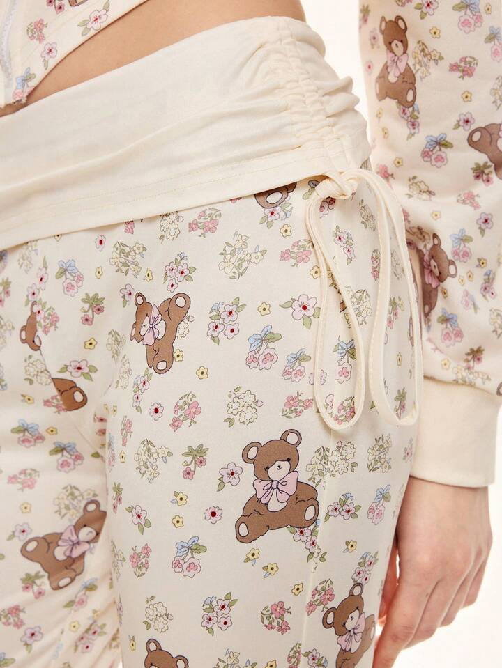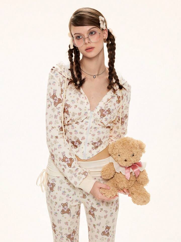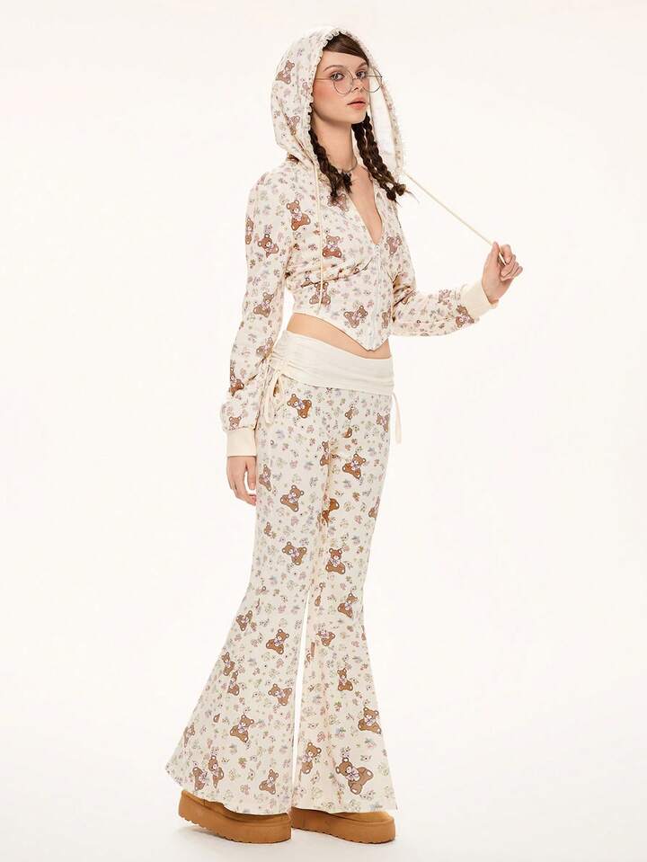 Kawaii Conjunto de 2 piezas de sudadera y pantalones con parches de encaje con estampado floral y oso lindo para mujer