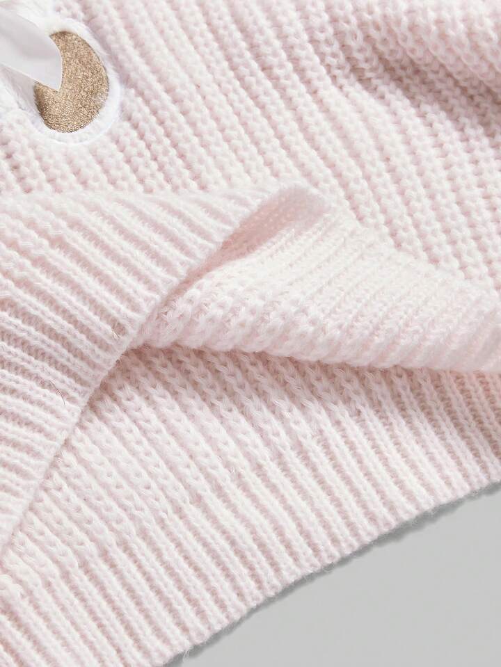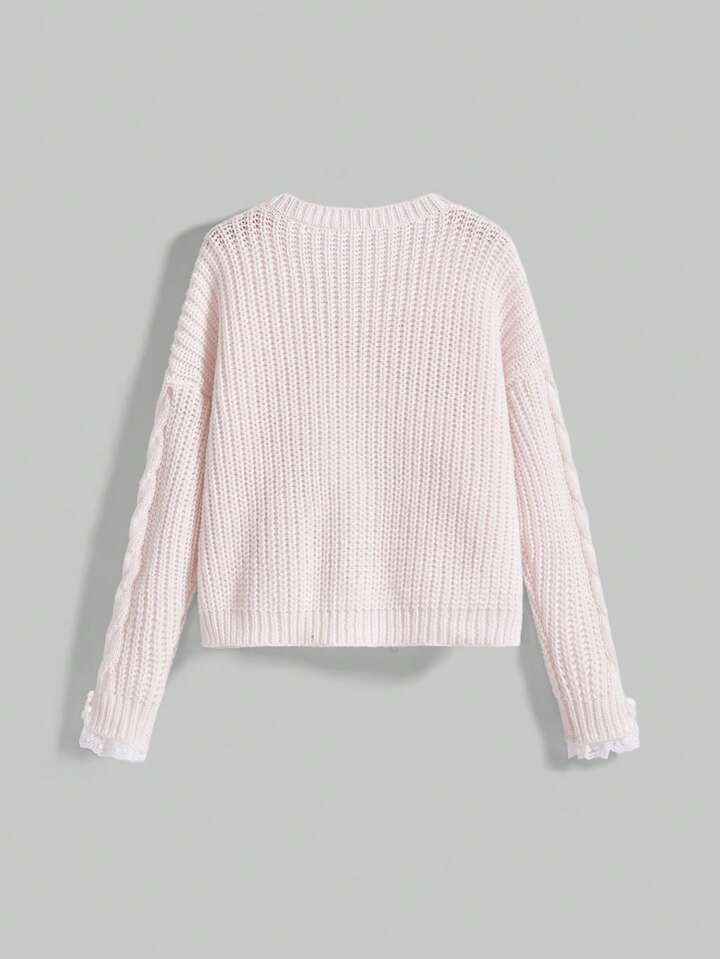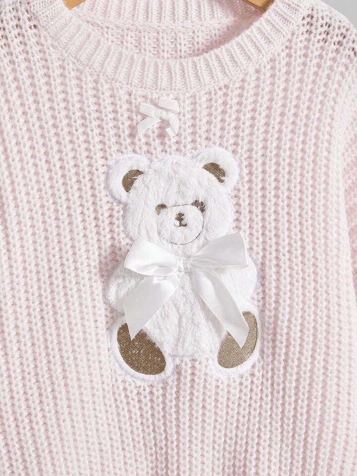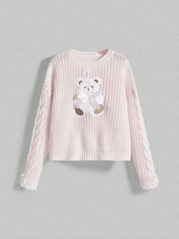 Kawaii Suéter de mujer con bordado de oso lindo, parche de encaje y lazo