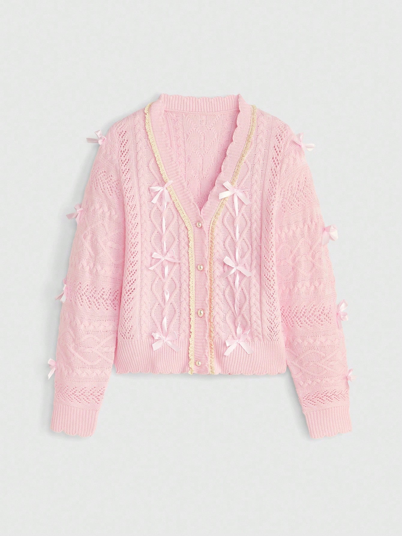Kawaii Cárdigan de punto con cuello en V, adornos de encaje y lazo de cinta, estilo escolar y lindo para mujer