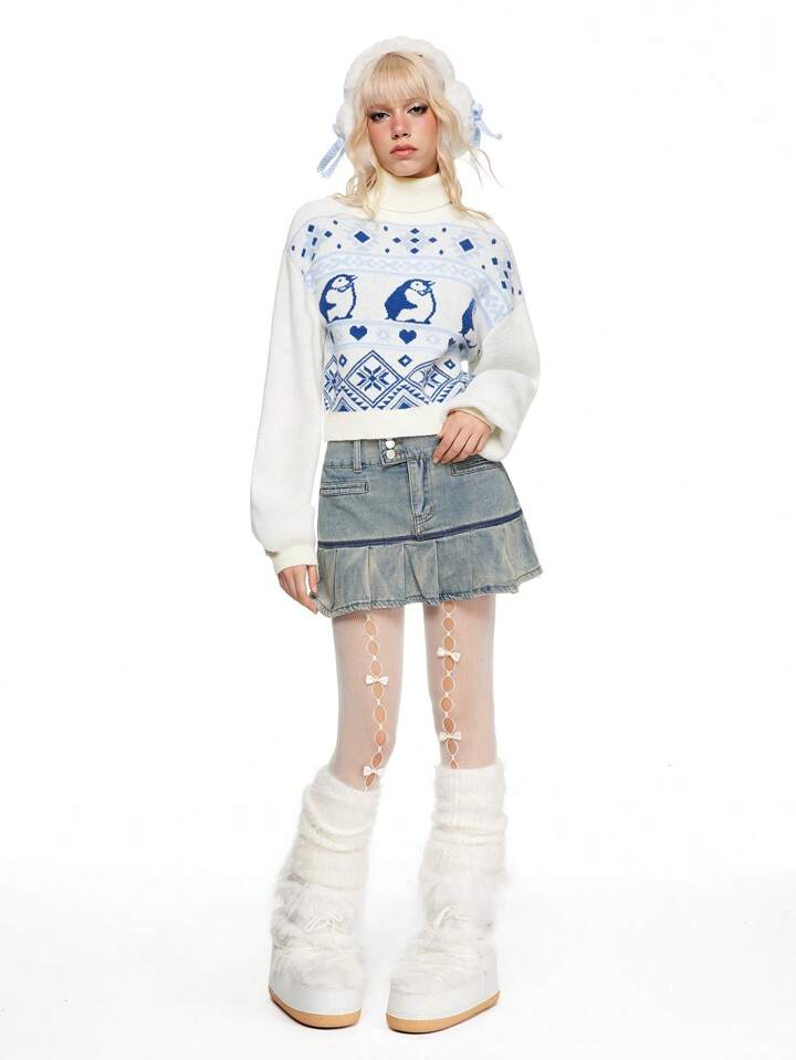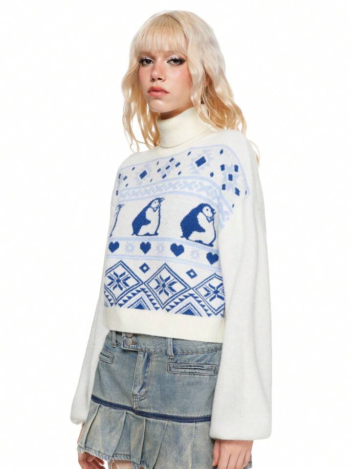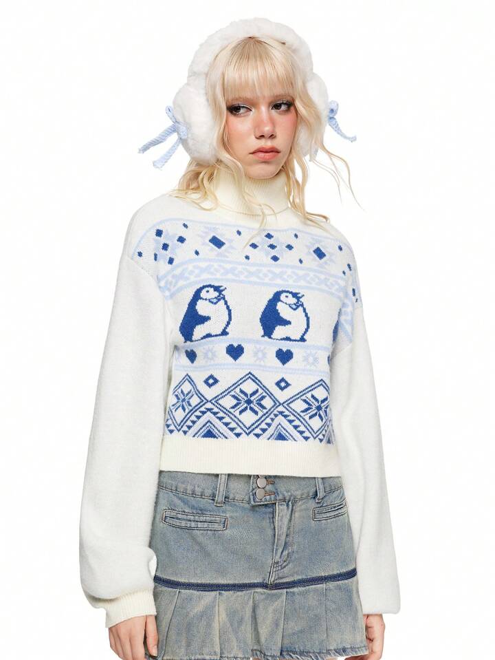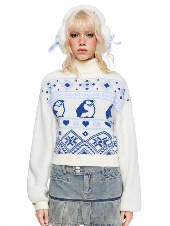 Kawaii Suéter de cuello alto con diseño de pingüino y estampado fair isle para mujer, apto para otoño/invierno