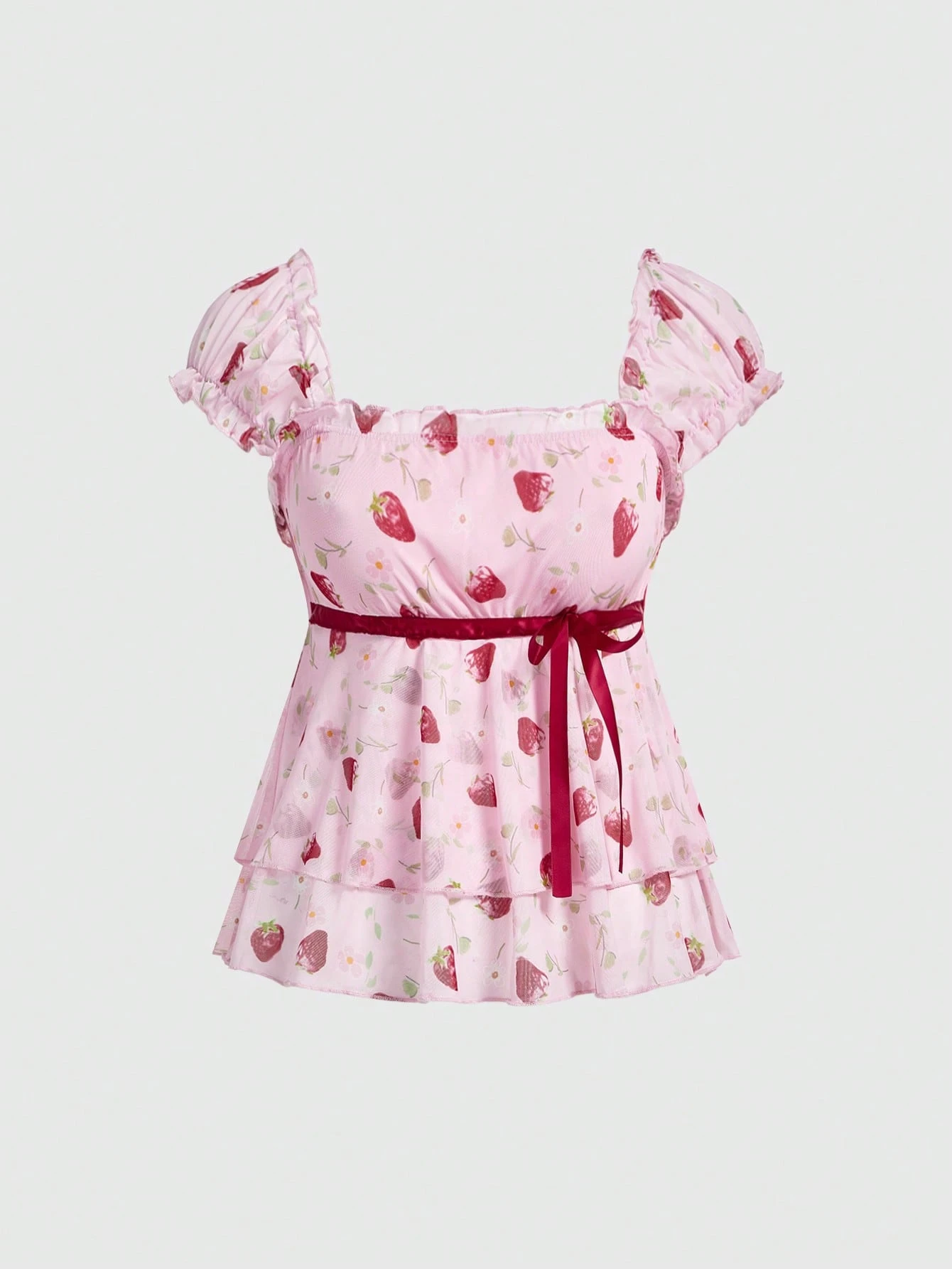 Kawaii Camiseta de mujer con cuello cuadrado, mangas abullonadas, lazo y estampado de fresa