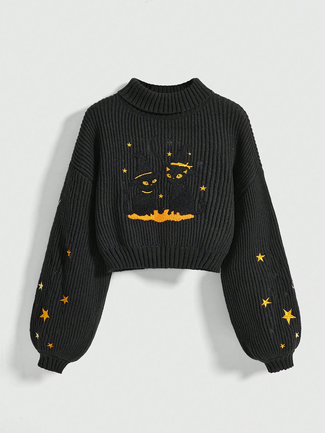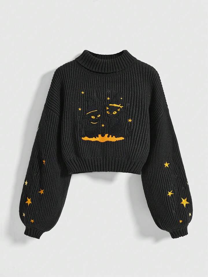 Kawaii Suéter de mujer con bordado de gato oscuro