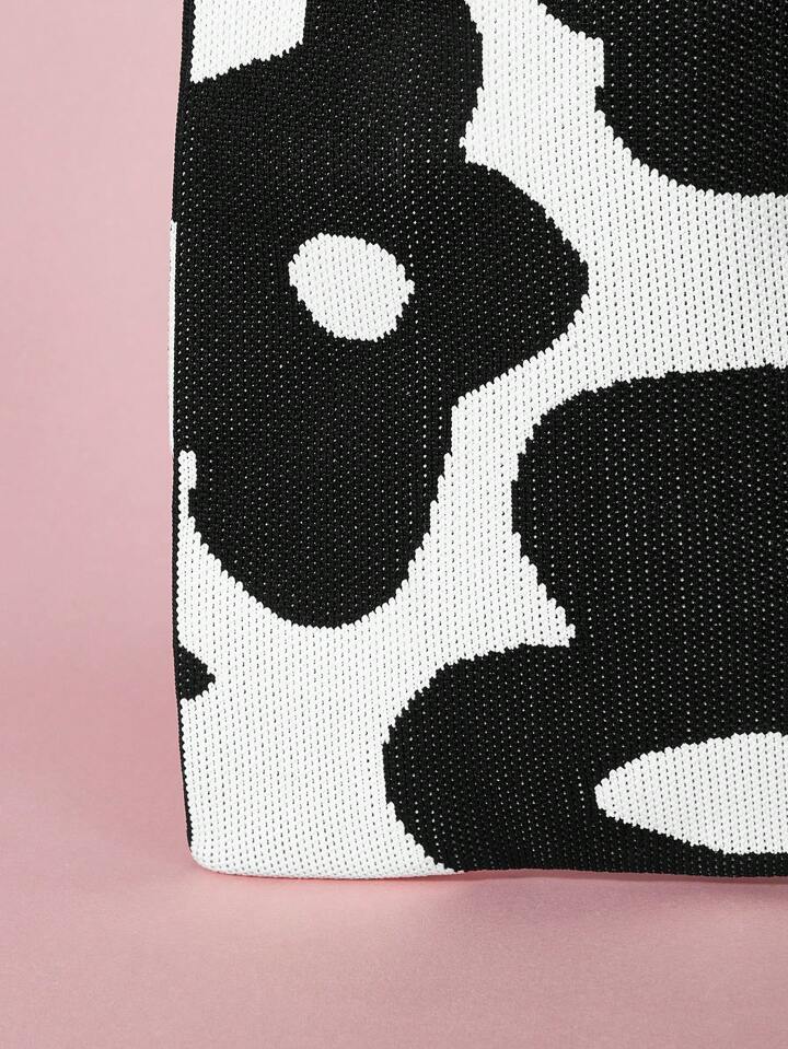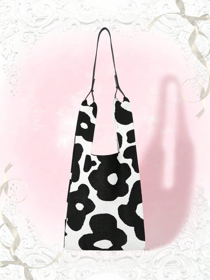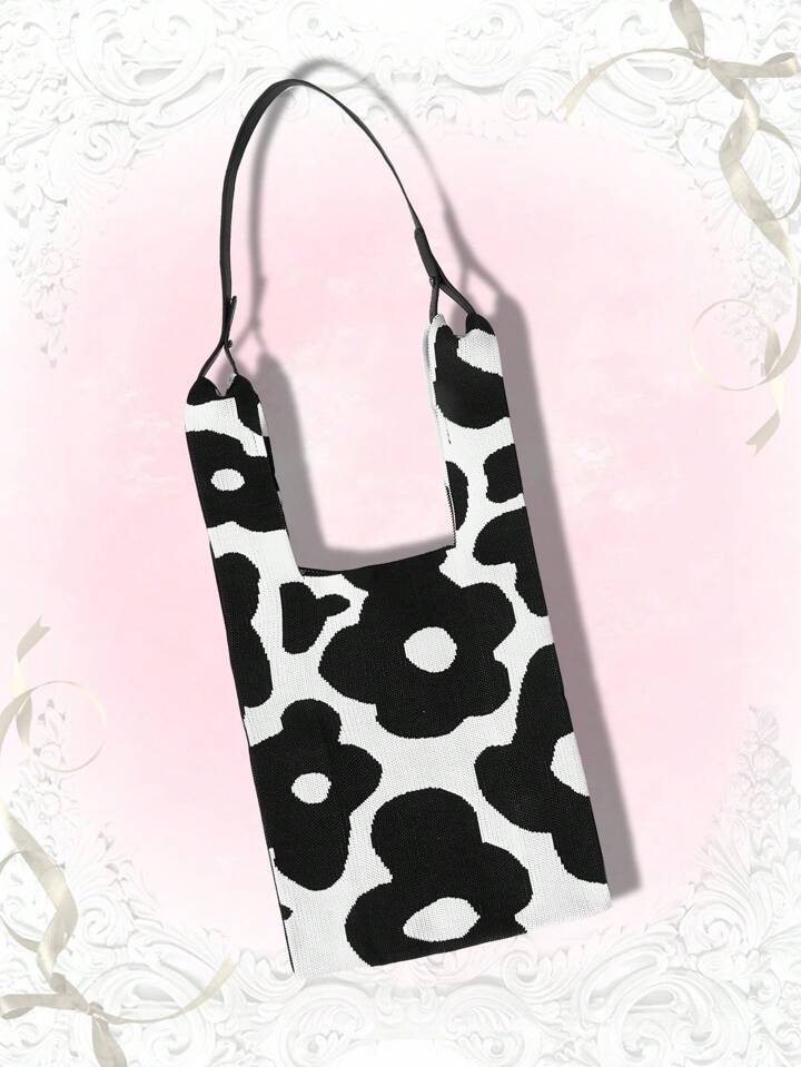 Kawaii Bolso De Hombro Negro Y Blanco Para Mujer Con Detalles Florales