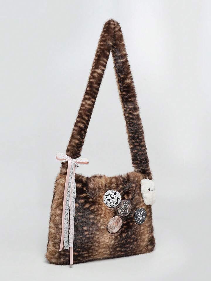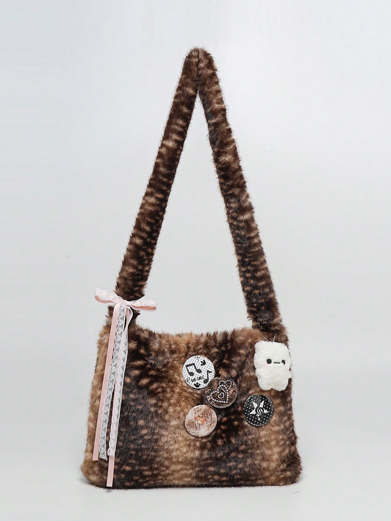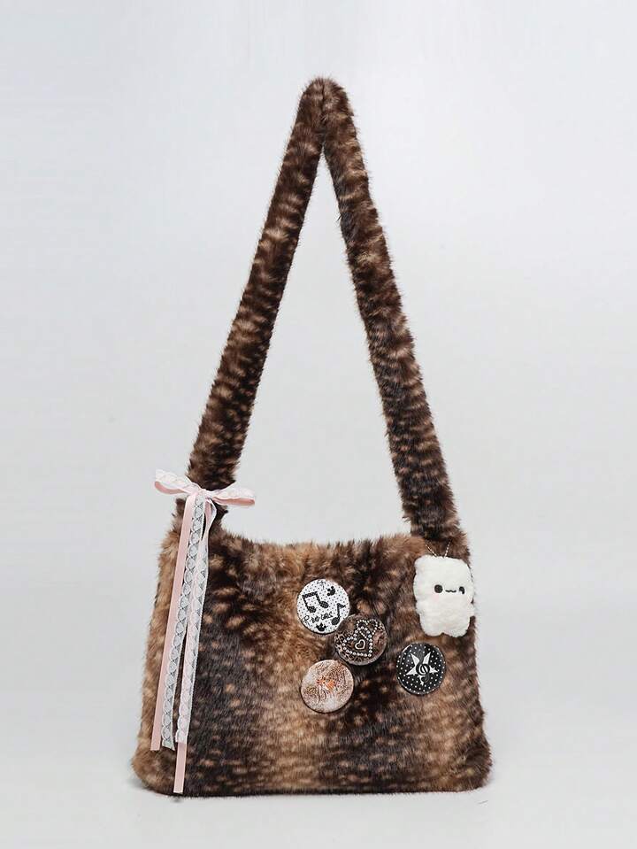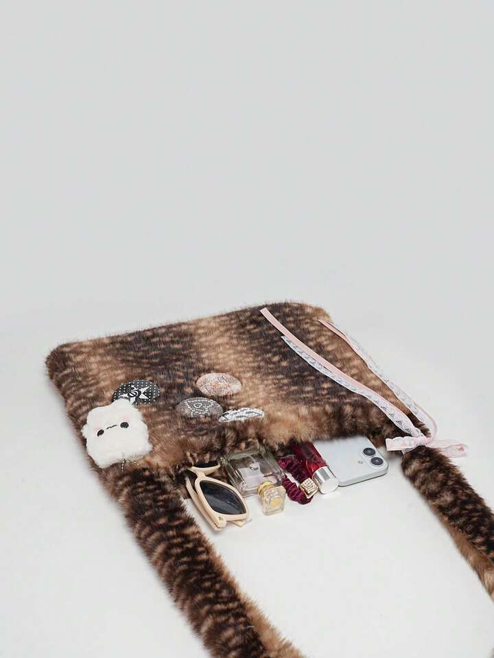 Kawaii Bolso de hombro/cruzado de mujer con capacidad grande, de pelo largo artificial, con estampado de leopardo y ciervo, de moda retro Y2K, grueso para otoño/invierno
