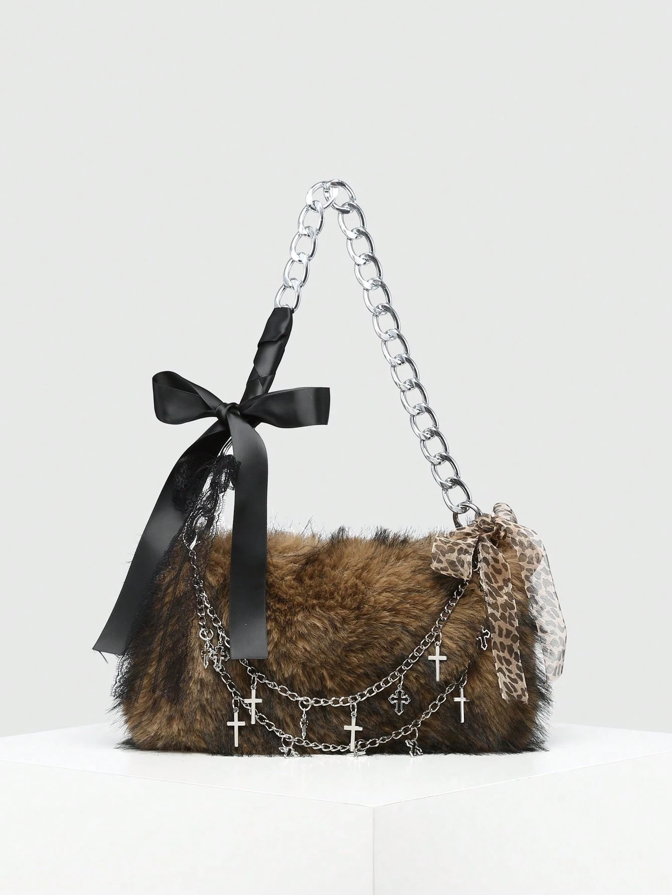Kawaii Bolso de hombro/cruzado de mujer con capacidad grande, de pelo largo artificial, con estampado de leopardo y ciervo, de moda retro Y2K, grueso para otoño/invierno