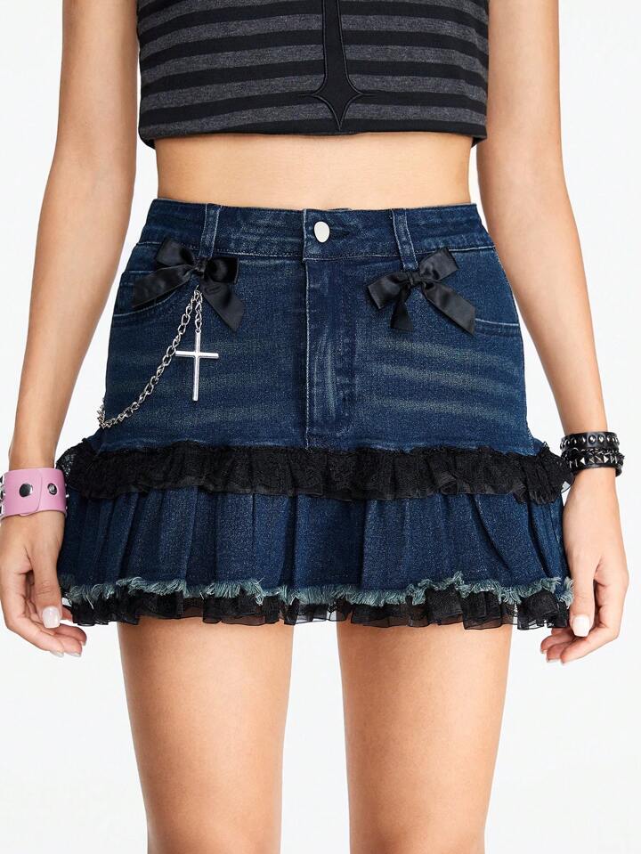 Kawaii Minifalda de mezclilla con micro-longitud, de cintura baja, con diseño cruzado de encaje multicapa y cadena, para escuela