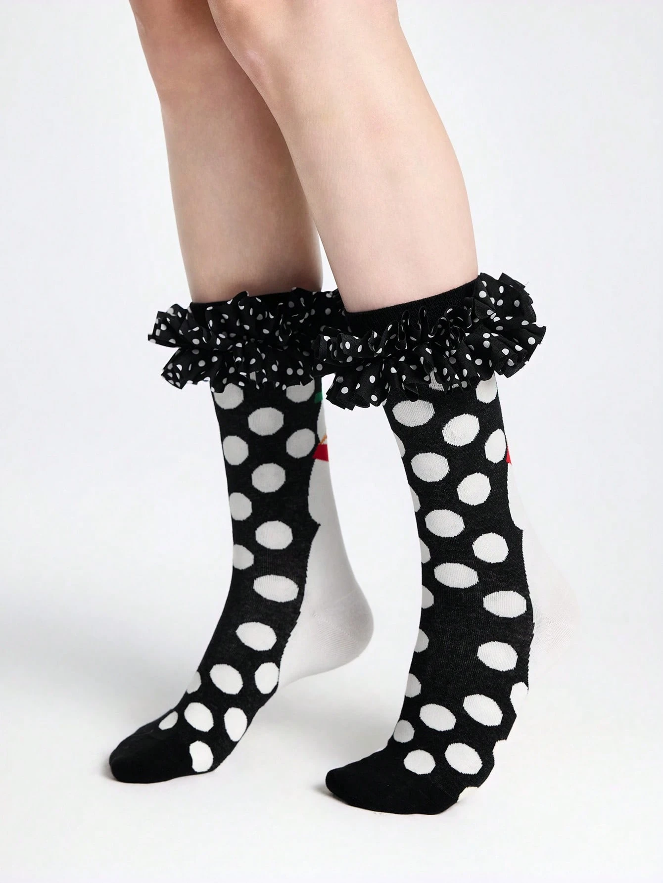 Kawaii Calcetines de tripulación lindos con estampado de lunares, empalme de malla y ribete de volantes para mujer