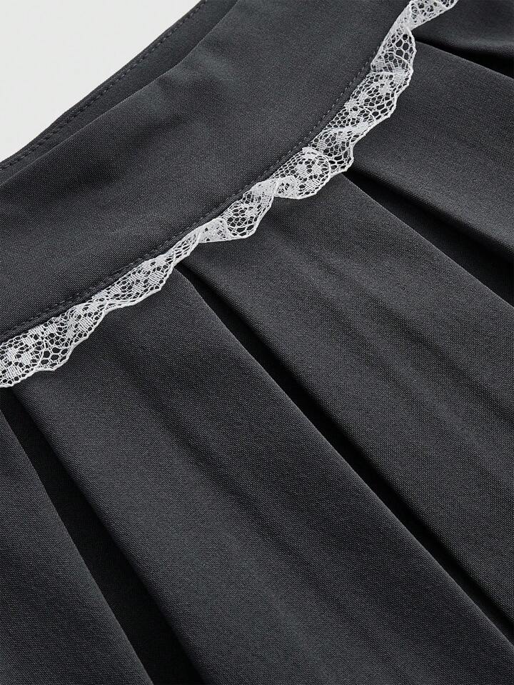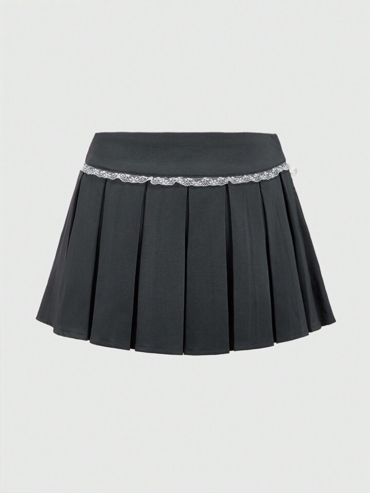 Kawaii Falda corta plisada con dobladillo de encaje, decoración de cinta y lazo, estilo ballet, para escuela, para mujer