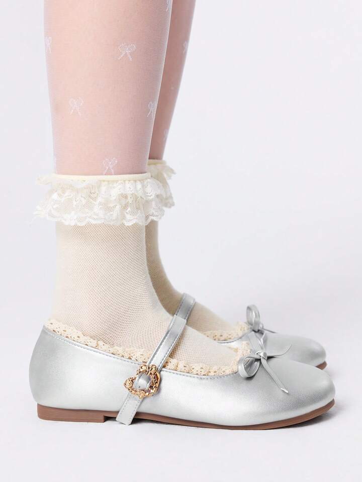 Kawaii Bailarinas planas de punta cerrada con lazo para mujer, zapatos de ballet estilo Lolita con plata